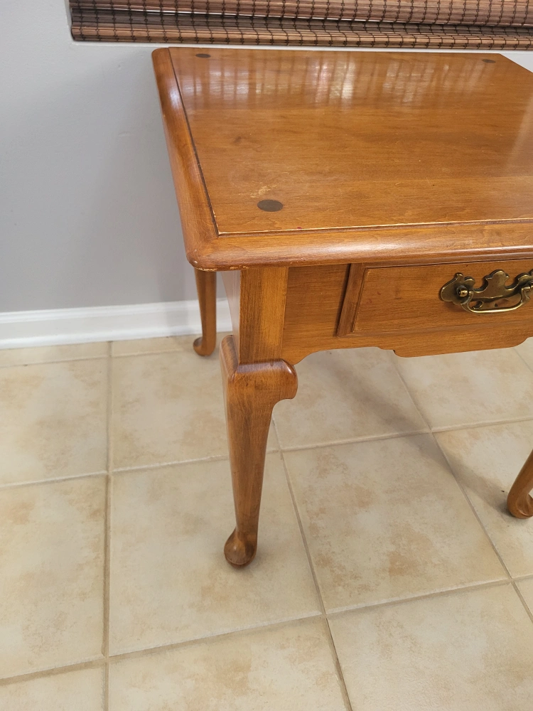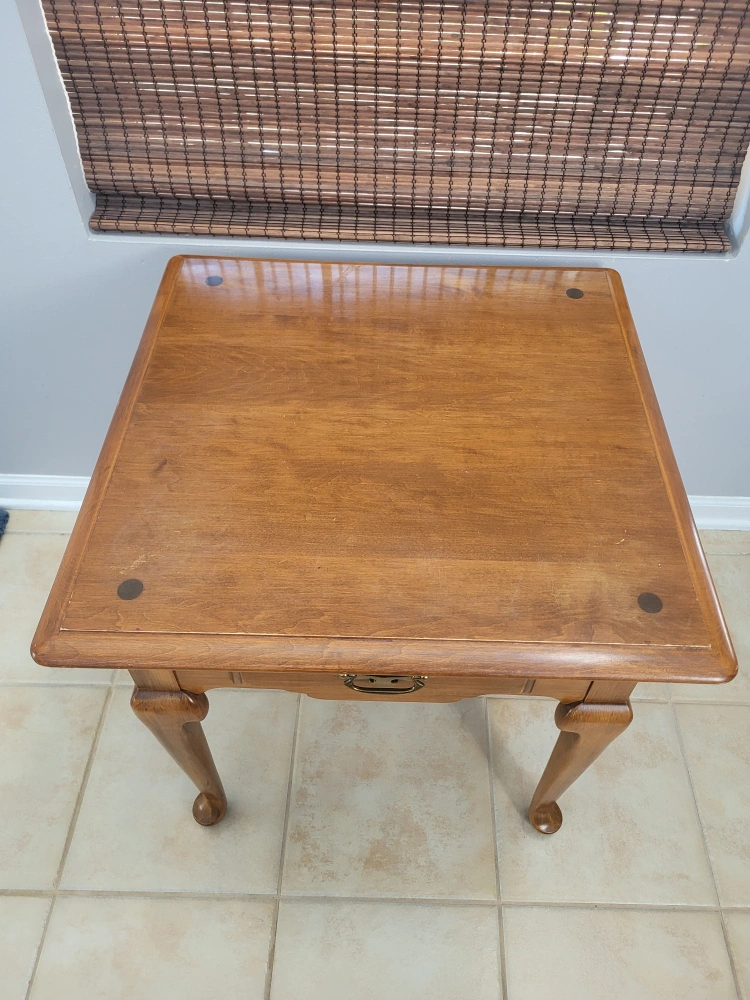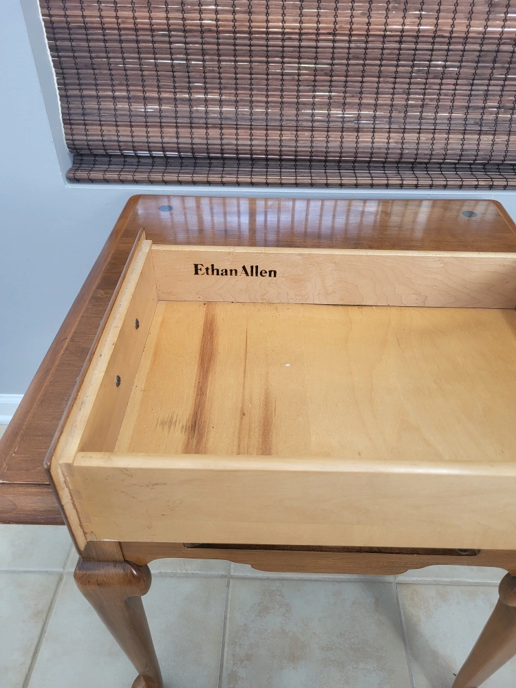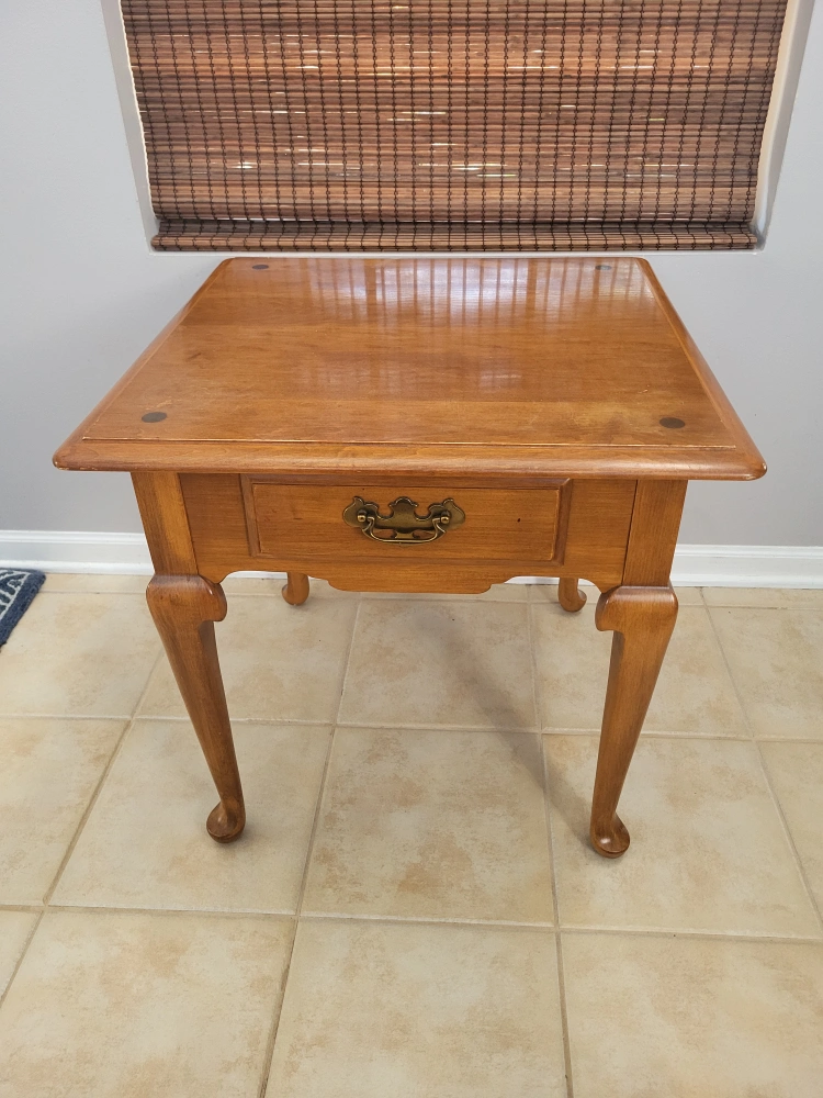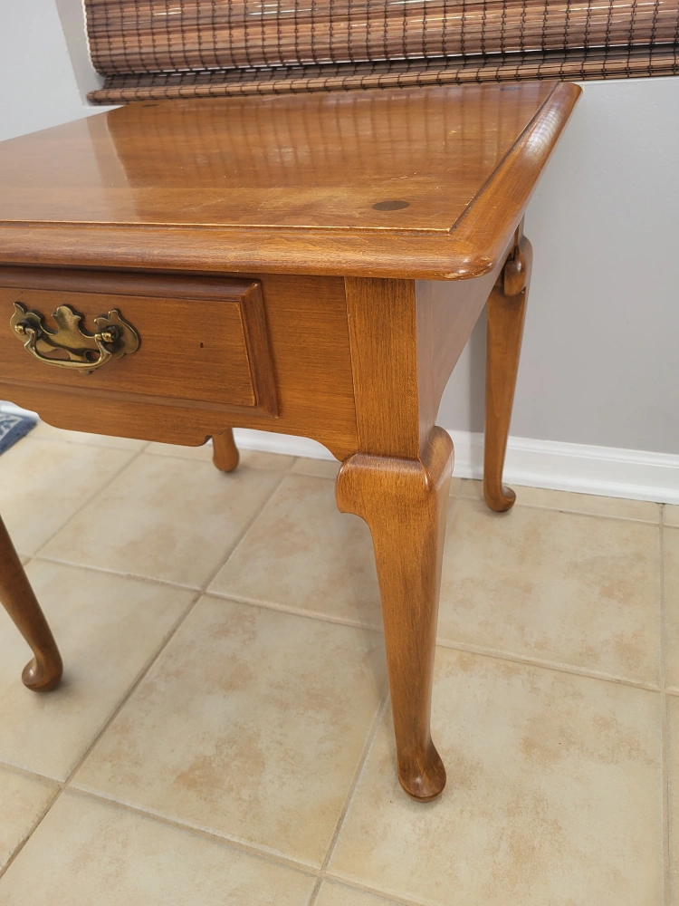 This is a lovely Ethan Allen end table. It has a warm wood finish and a classic design with a drawer. It's in good condition and ready to add a touch of elegance to your living room or bedroom