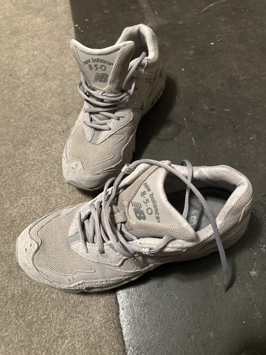 Gray New Balance 850 running shoes. Features a suede and mesh upper. Lace-up closure for a secure fit. These are great for everyday wear or light athletic activities.