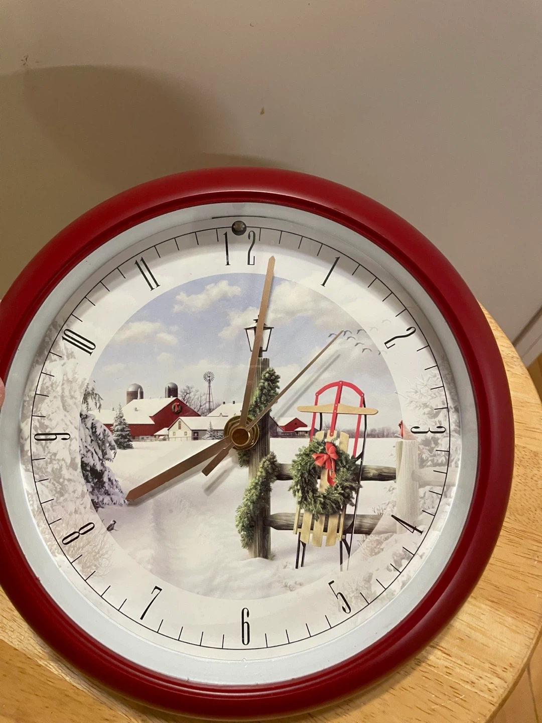 This charming 8 inch wall clock features a festive Christmas farmhouse scene with a red frame.