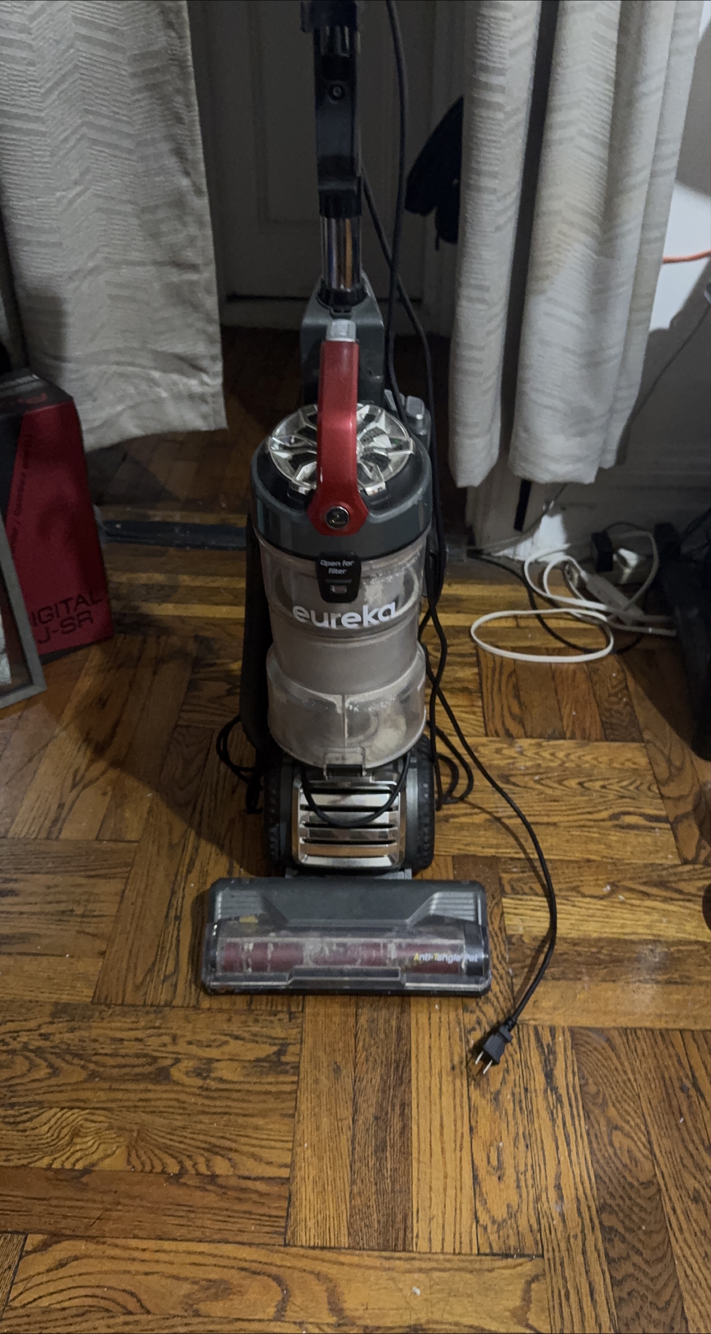 Selling a Eureka vacuum cleaner. It has a red handle and an anti-tangle pet brush. It's in used condition.