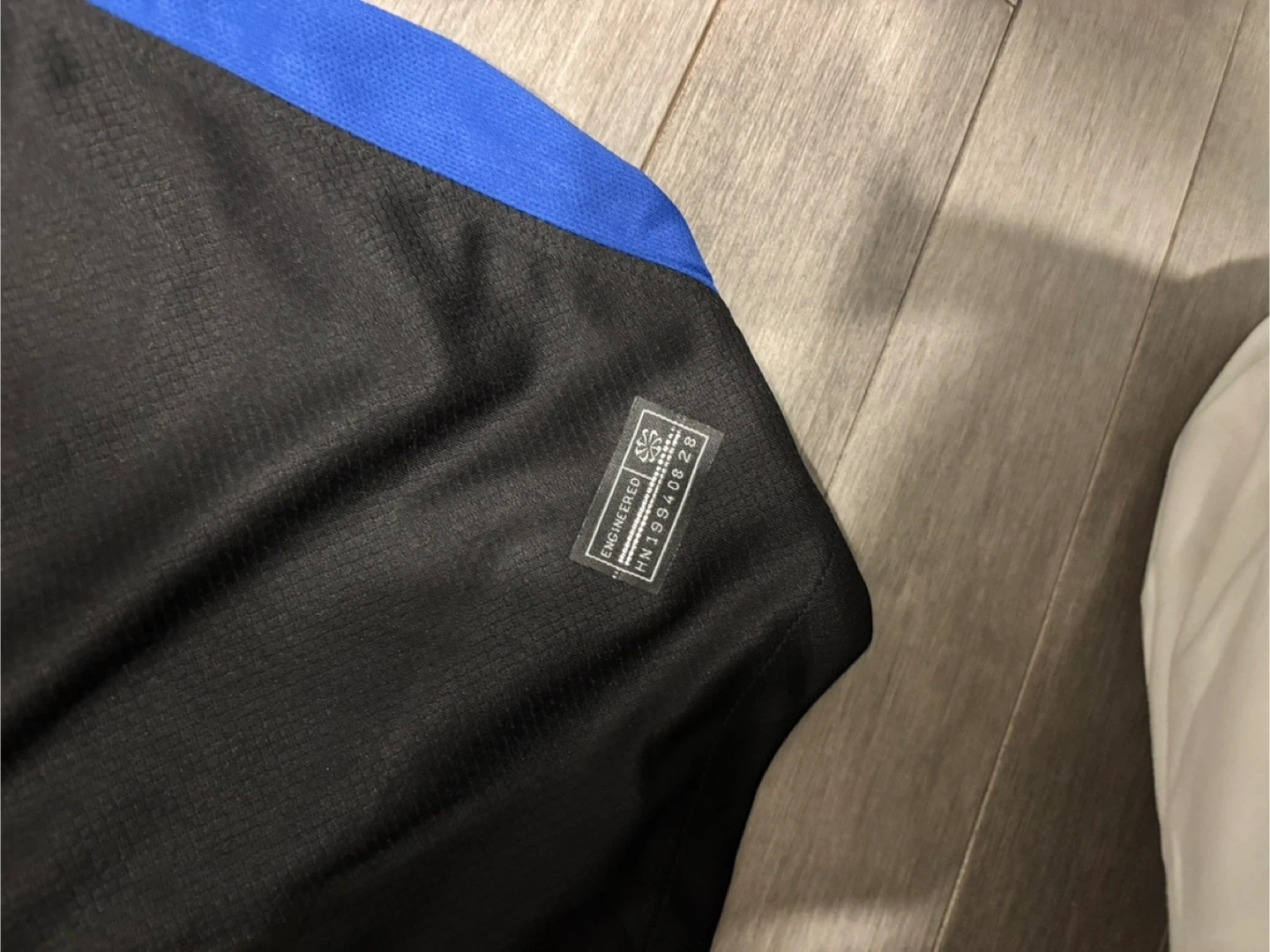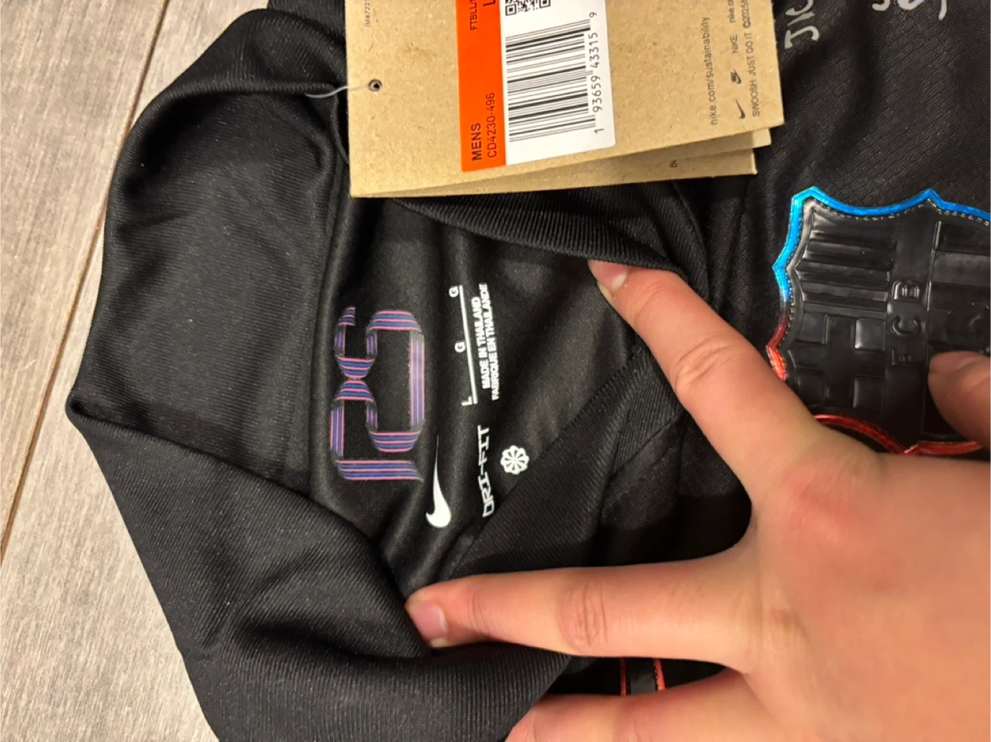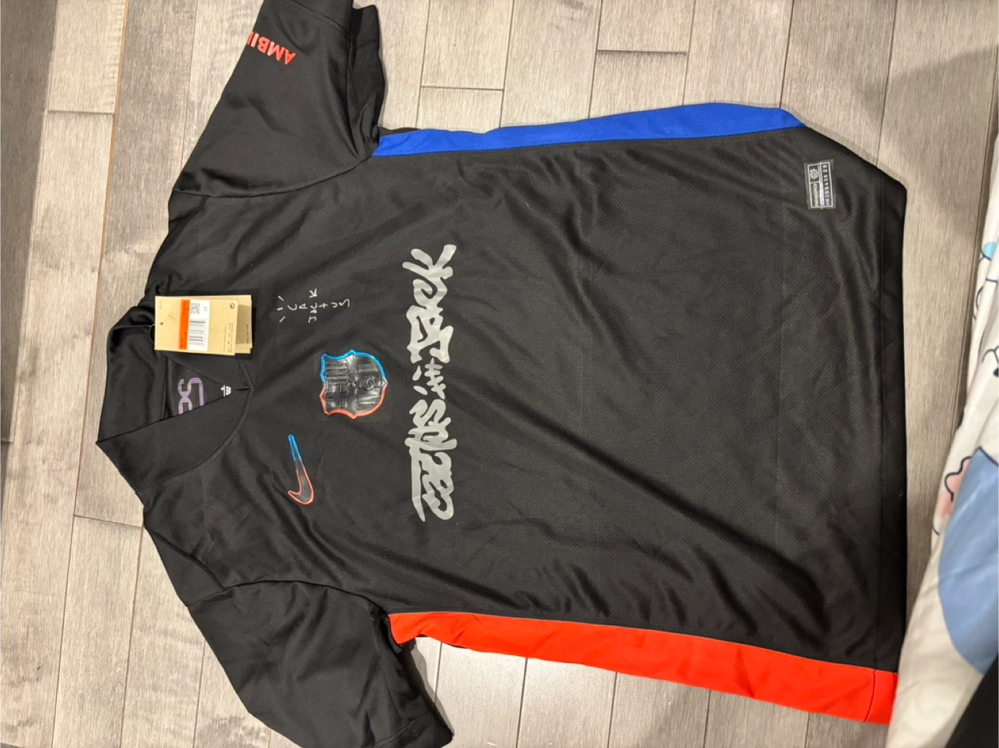 This is a Nike FC Barcelona jersey featuring a collaboration with Travis Scott. It's black with blue and red accents. Made with Dri-FIT material. Size is large but it fits like a medium and little baggy for a small