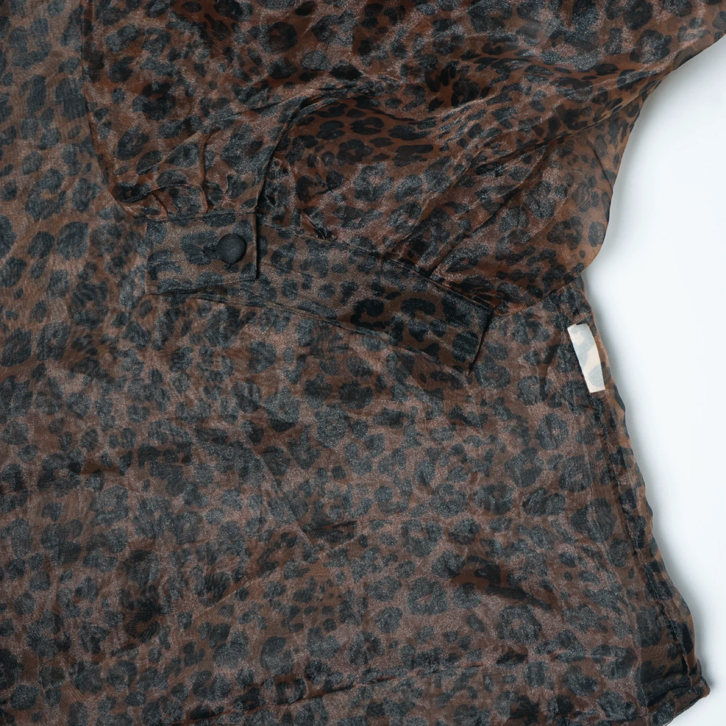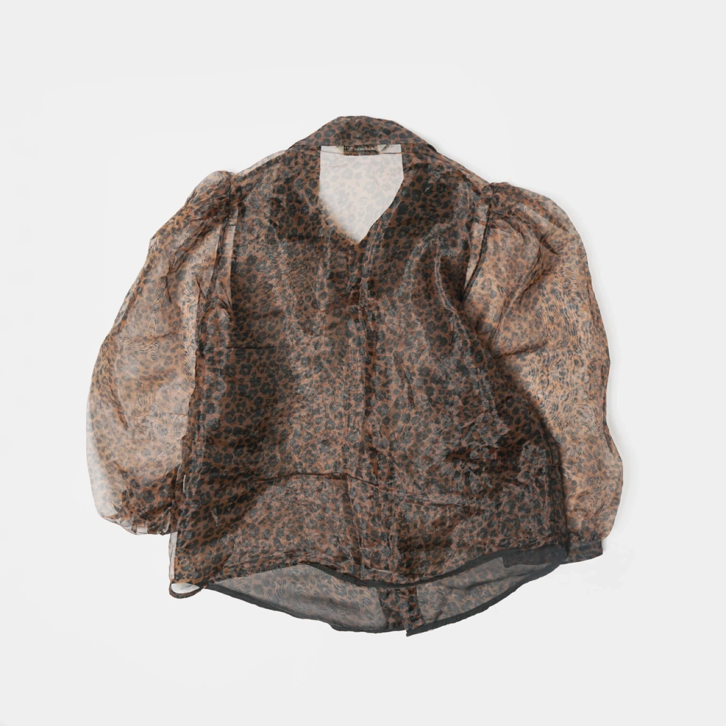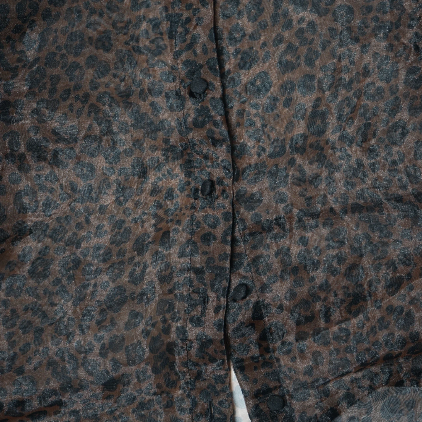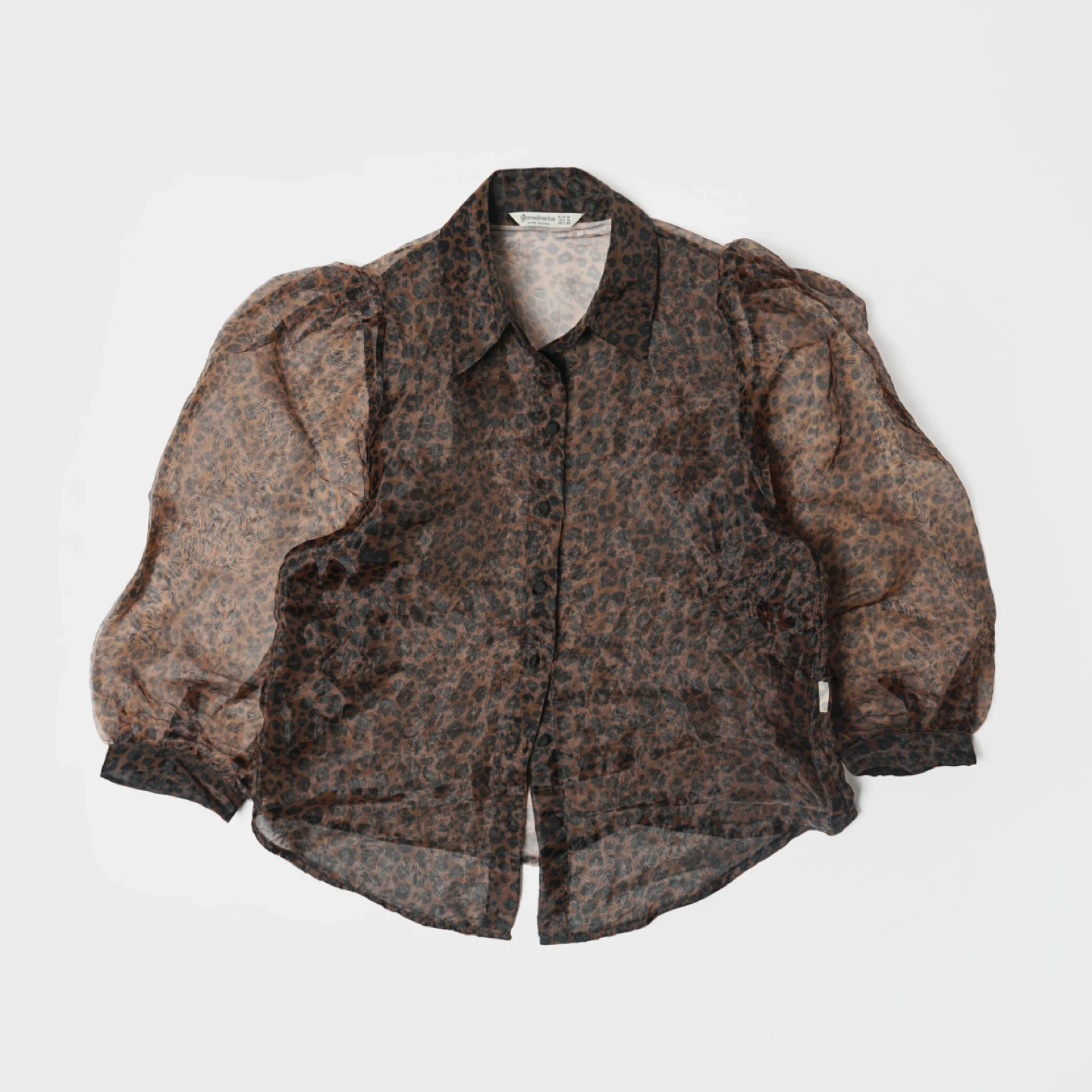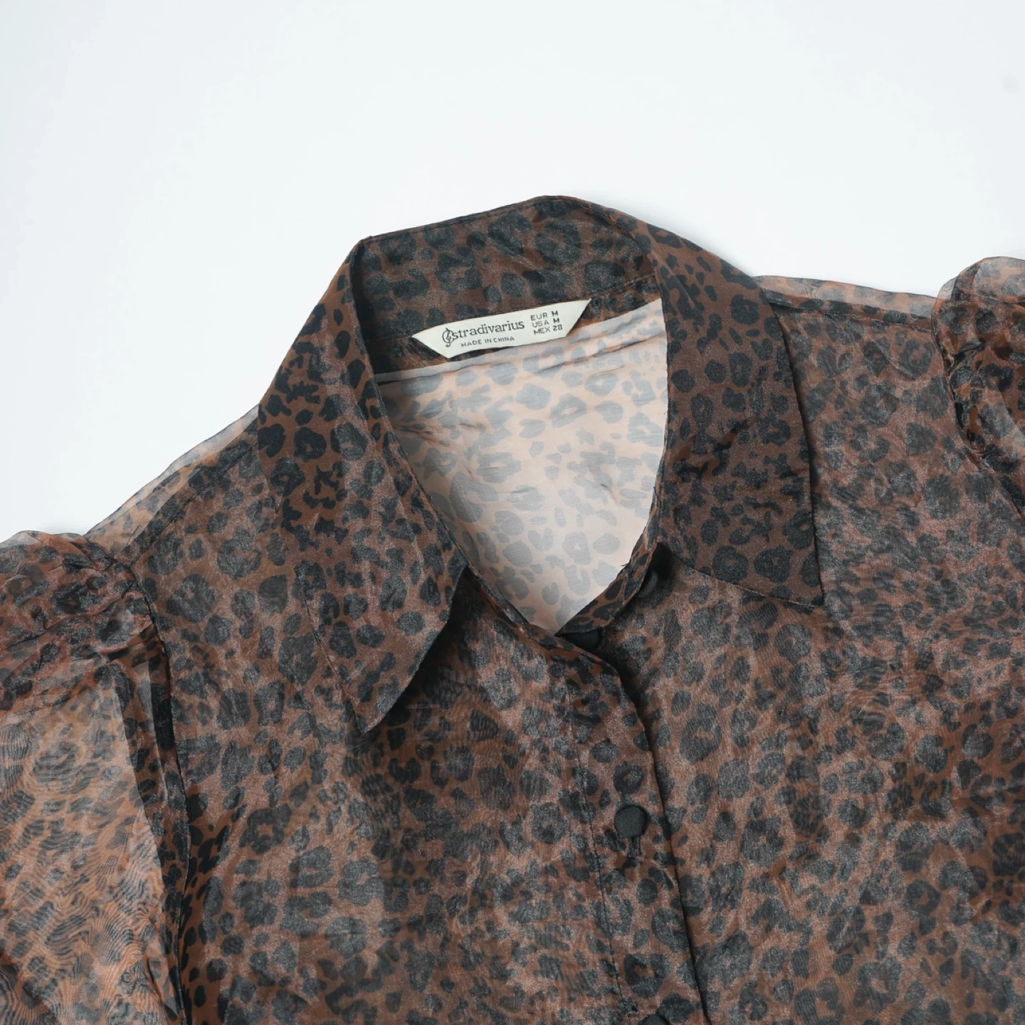 Sheer leopard print button-up blouse from Stradivarius. Features puffed sleeves and a collared neckline. Size is large.