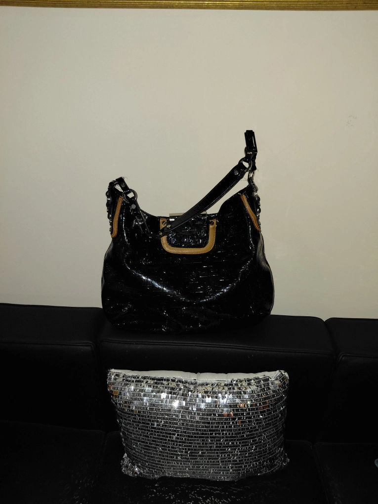 Selling a Tory Burch hobo bag in black patent leather. It has a shiny finish with the Tory Burch logo pattern embossed throughout. The interior is lined with a light-colored fabric. It's in good condition and ready for a new home!