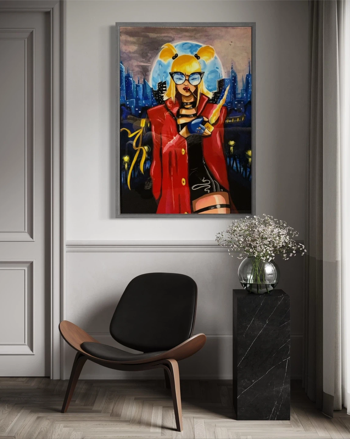 Framed Pop Art original painting - Woman with Lighter