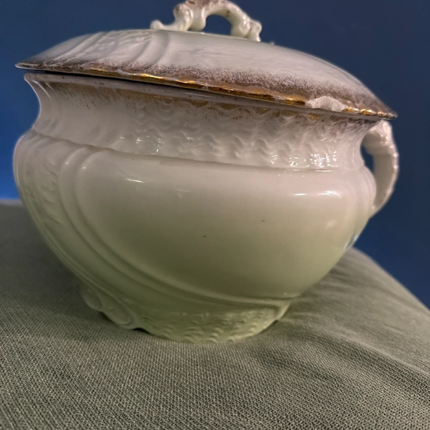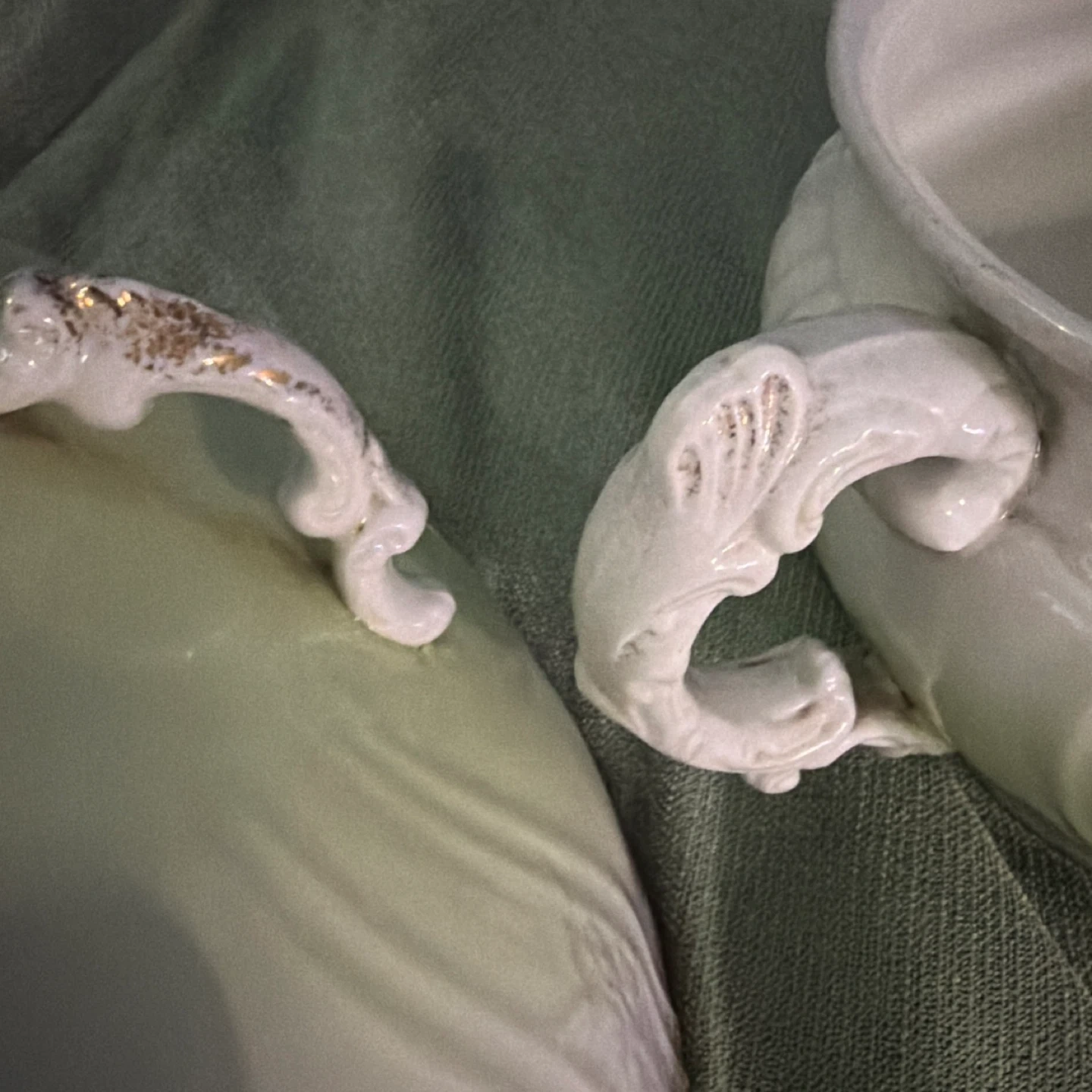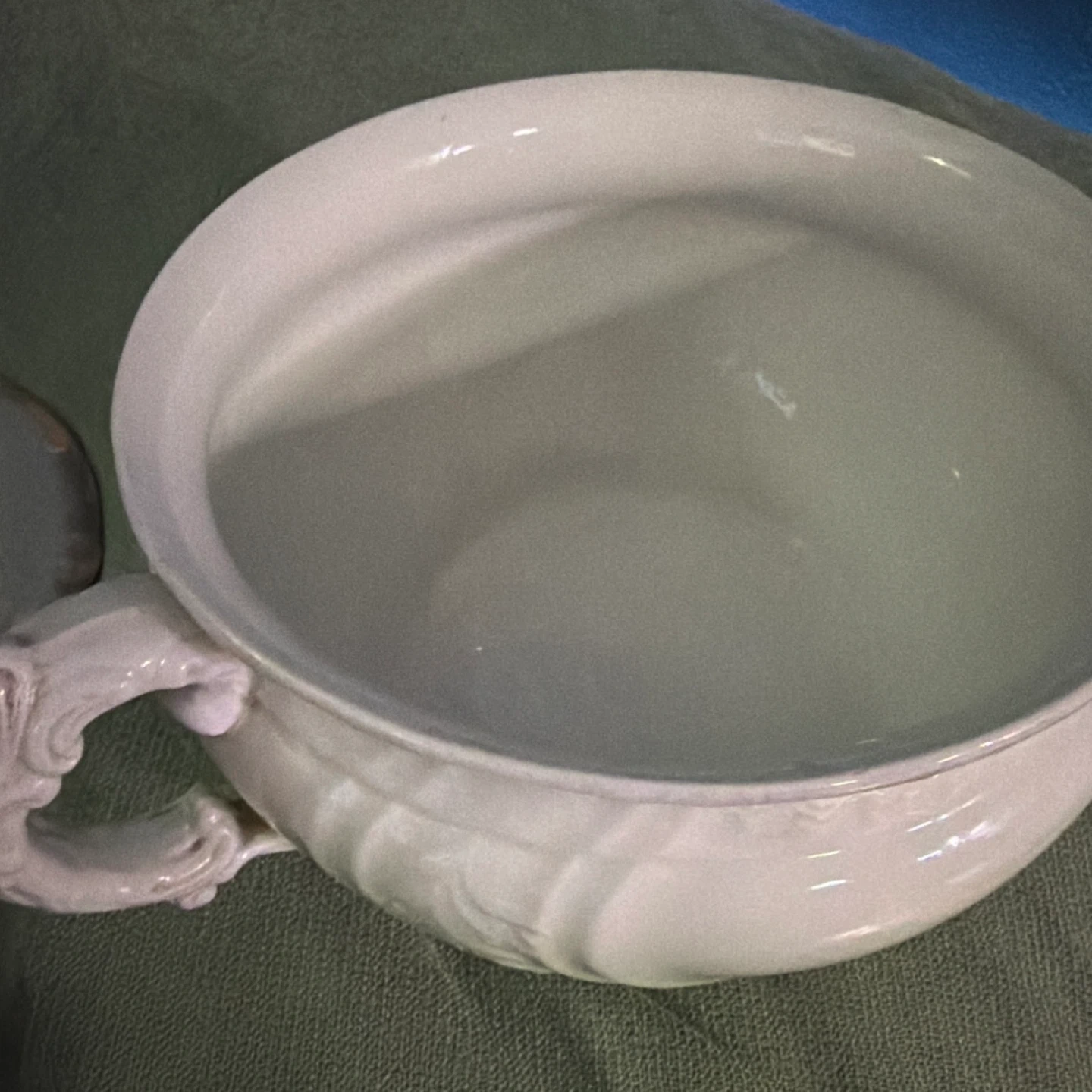 Antique wash basin bowl made by John Maddock & Sons. It's part of their Royal Vitreous collection. Features ornate handles and a pale green exterior.