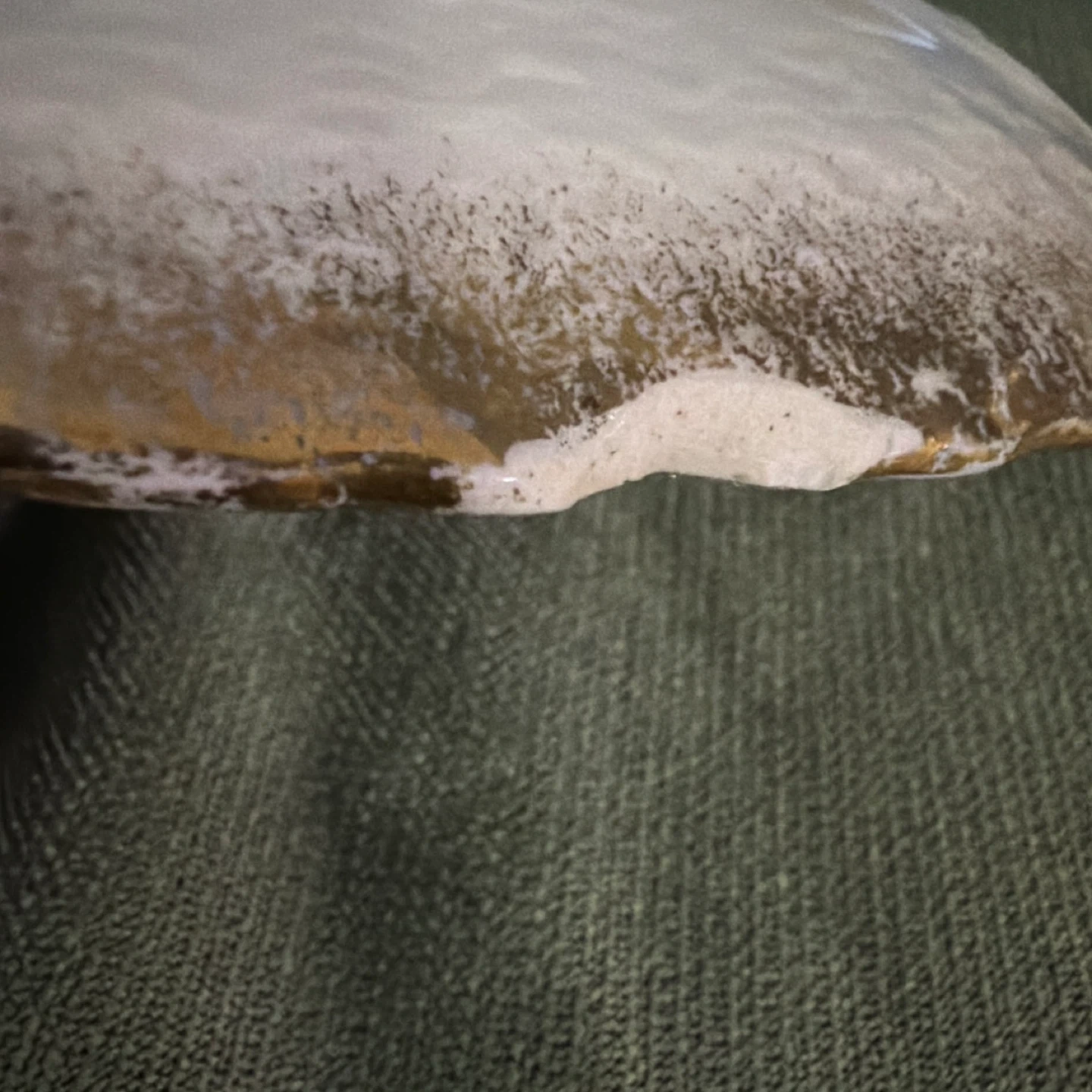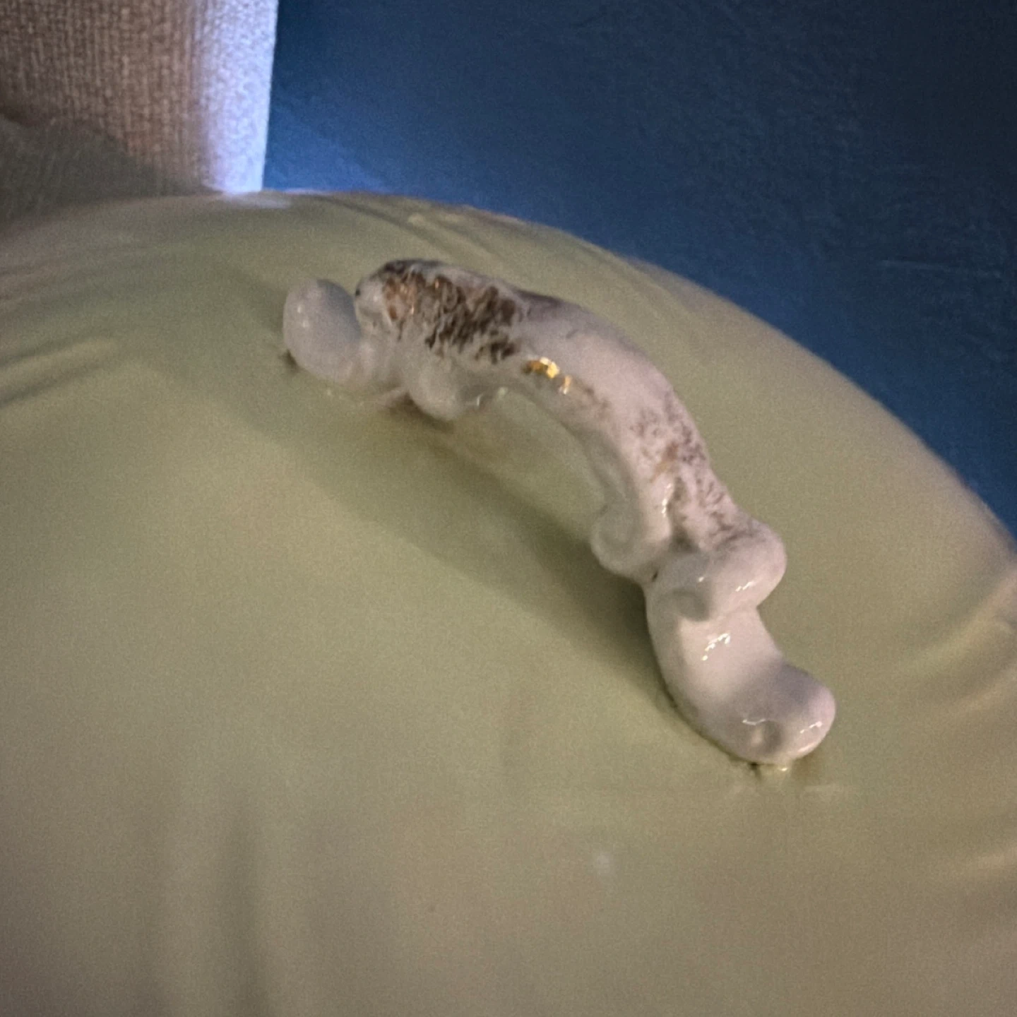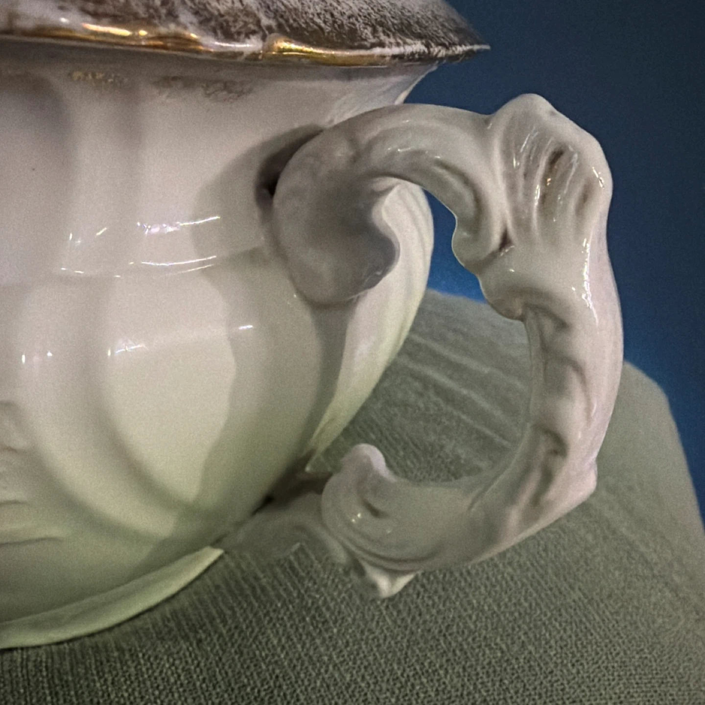 Antique wash basin bowl made by John Maddock & Sons. It's part of their Royal Vitreous collection. Features ornate handles and a pale green exterior.