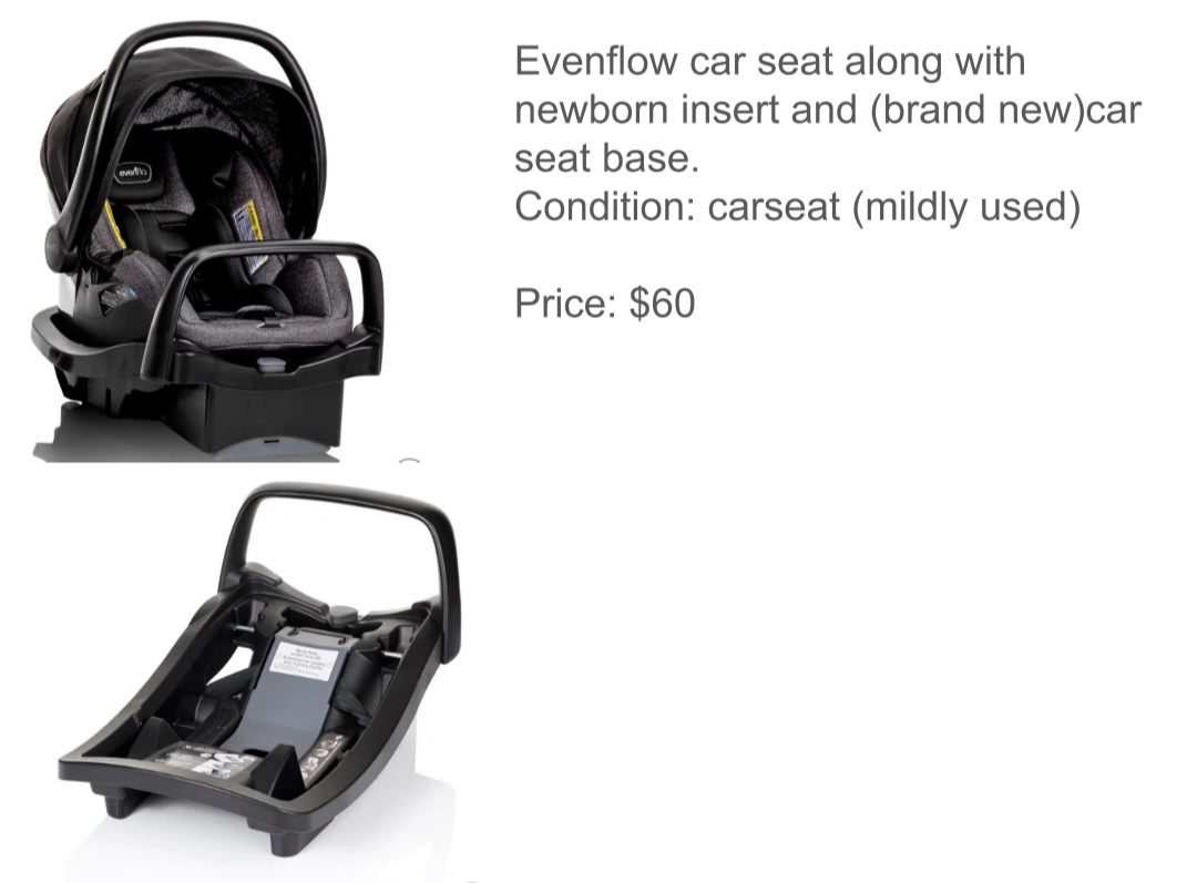 Selling an Evenflo car seat that comes with a newborn insert and car seat base. Carseat is in mildly used condition and base is brand new ready for a new family!