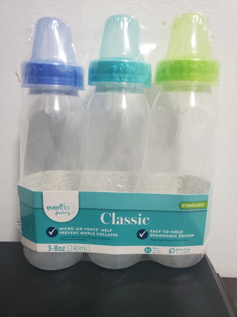 Selling a new pack of Evenflo Classic baby bottles! This set includes three 8oz (240mL) bottles designed with micro air vents to help prevent nipple collapse, and they feature an easy-to-hold ergonomic design. Suitable for babies 0m+ and BPA free