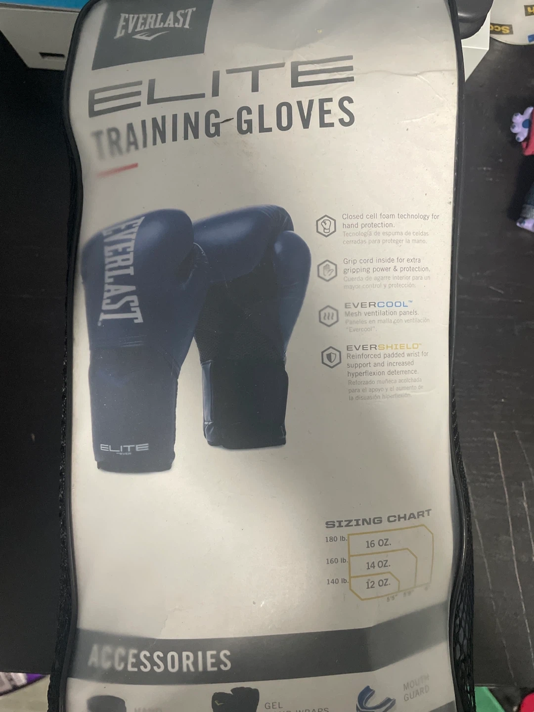 10Selling a pair of Everlast Elite Training Gloves. They are 12 oz and come with the original packaging. They feature EVERCOOL mesh ventilation panels and EVER SHIELD reinforced padded wrap for support and increased hyperflexion deterrence