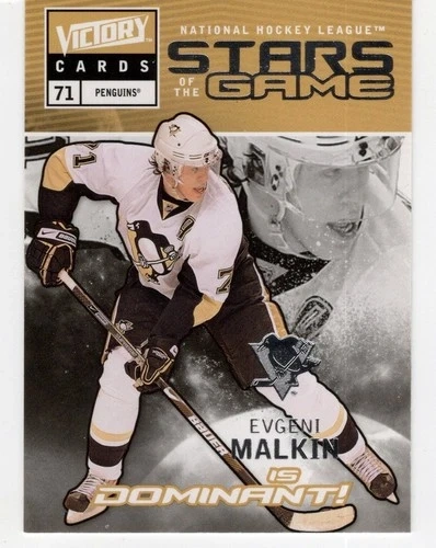 652009-10 Upper Deck Victory Stars Of The Game insert trading card featuring Evgeni Malkin of the Pittsburgh Penguins. This original sports trading card is from the National Hockey League (NHL) and was manufactured by Upper Deck in the United States. The card showcases Malkin as a standout player in the 2009-10 season, making it a valuable collectible for fans of ice hockey and sports trading cards.