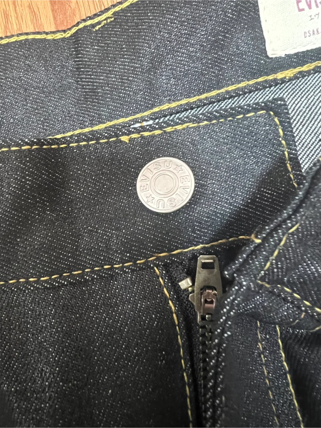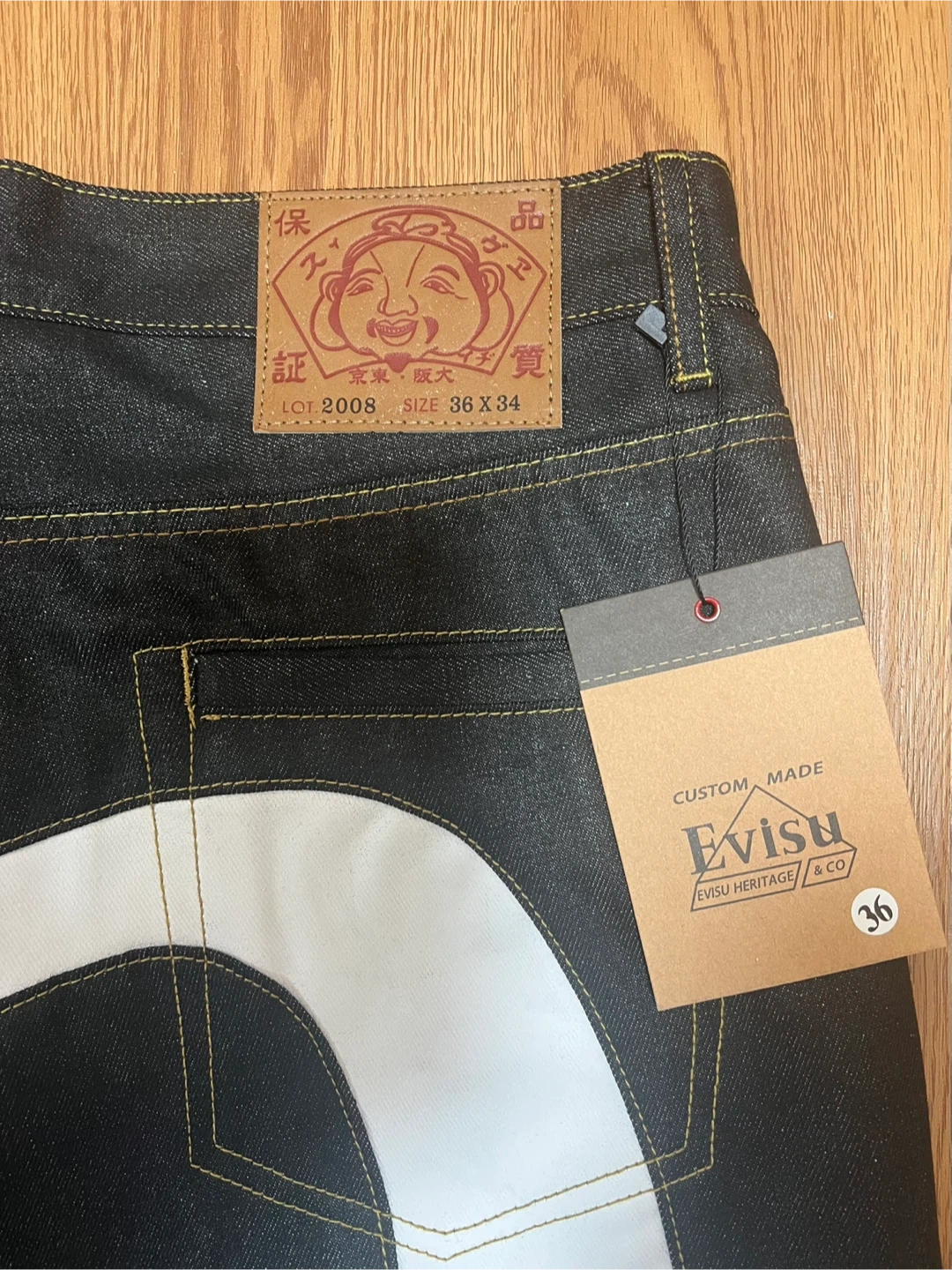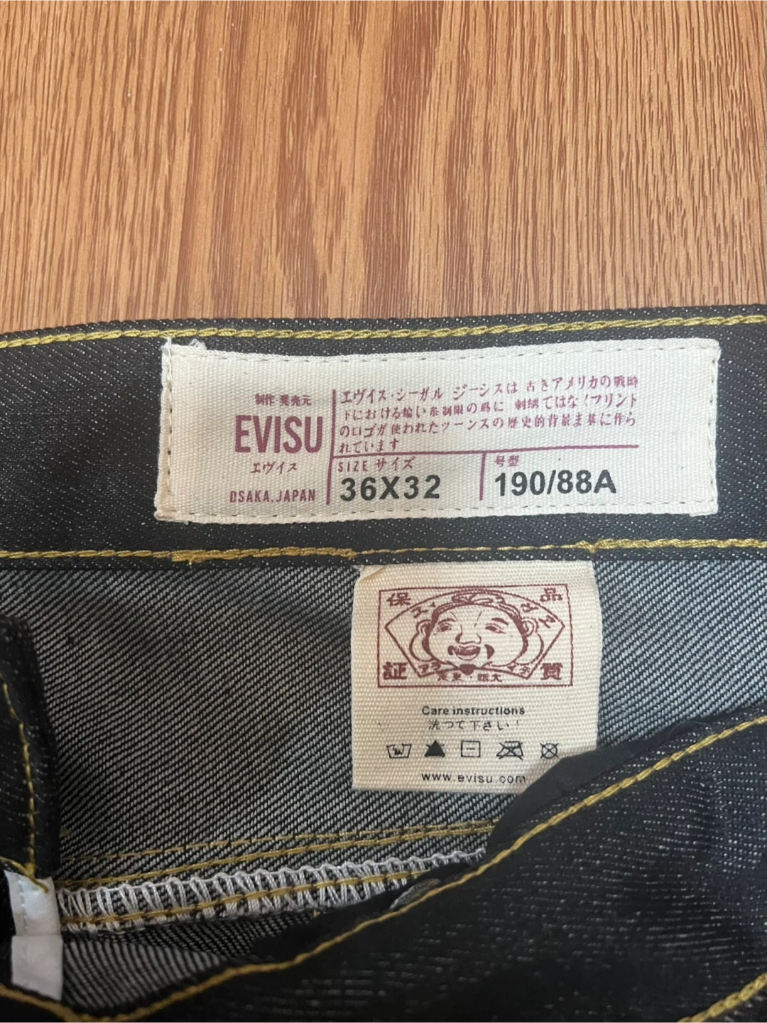 10Selling a pair of Evisu jeans in size 36x34. They feature a unique design with white stripes and a red flower logo on the back pockets. The jeans are in great condition and ready for a new home! Available sizes: 30*30, 32*32,34*34,36*34,38*36,40*38 Lmk which size you need, better size up since it runs smaller than US sizes