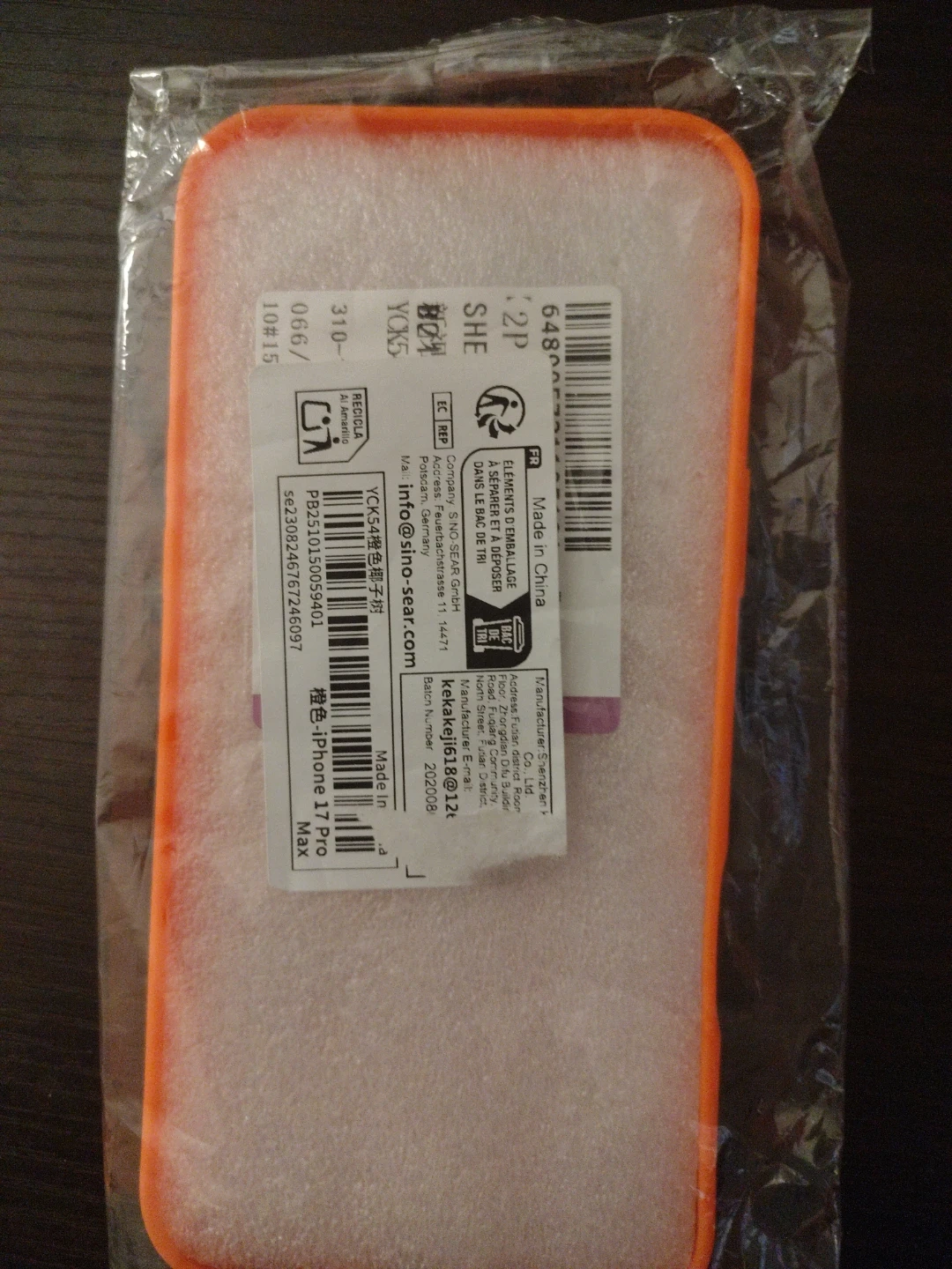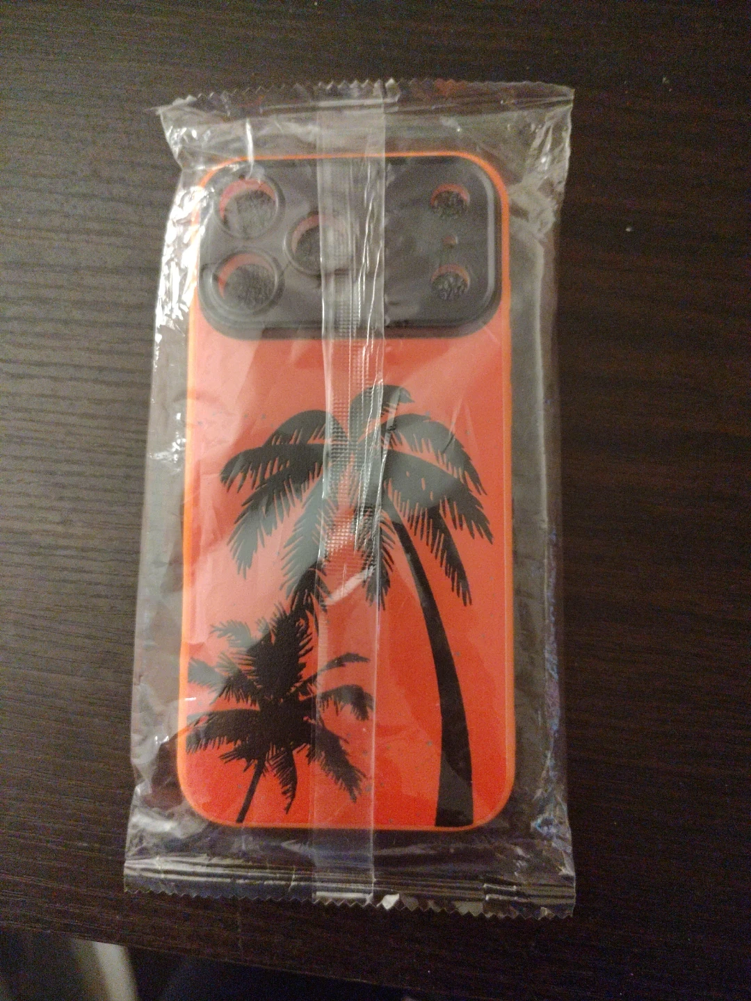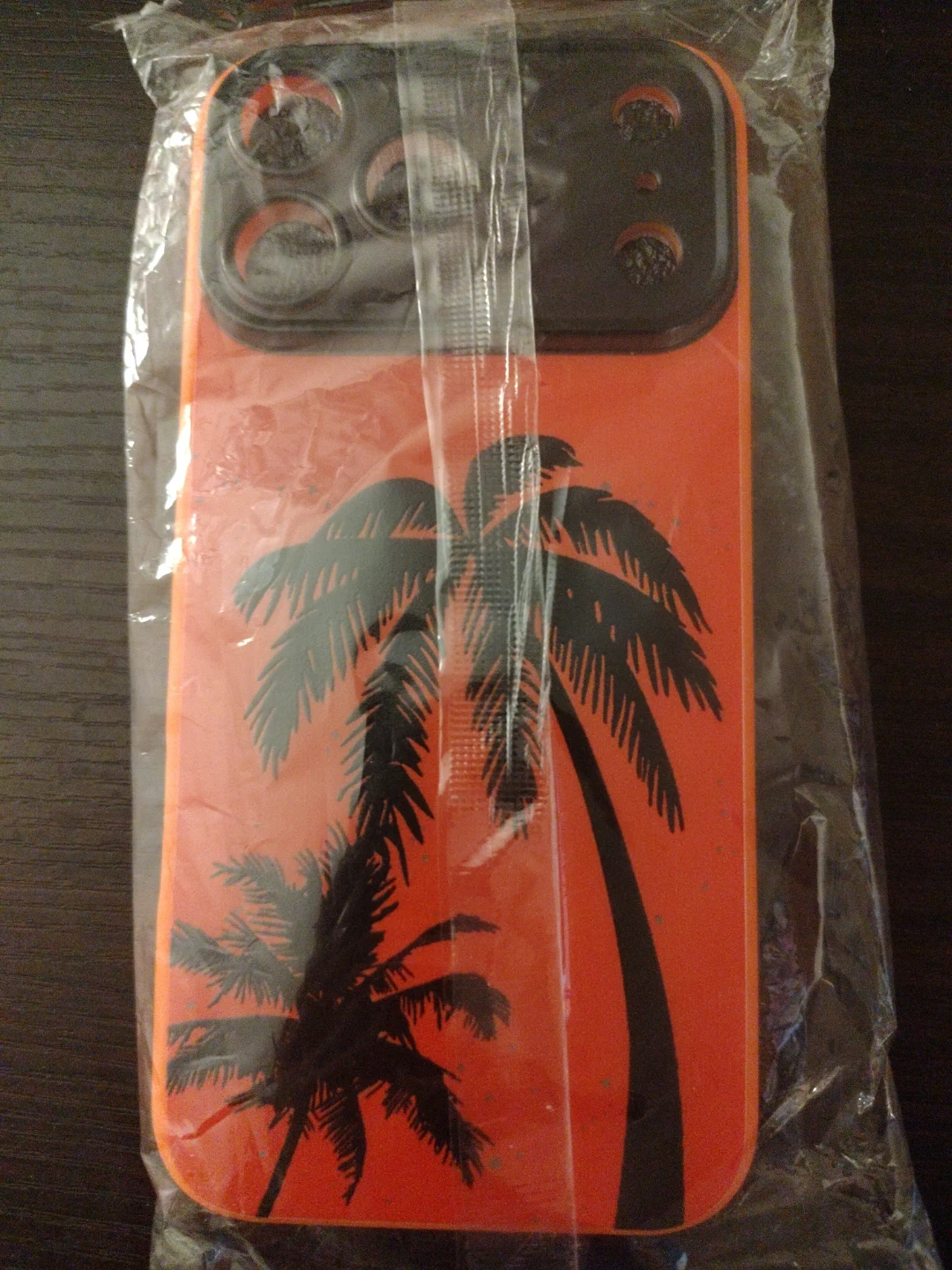 Orange phone case with a black palm tree silhouette design. Fits iPhone 14 Pro Max. Made in China. Includes protective foam insert.