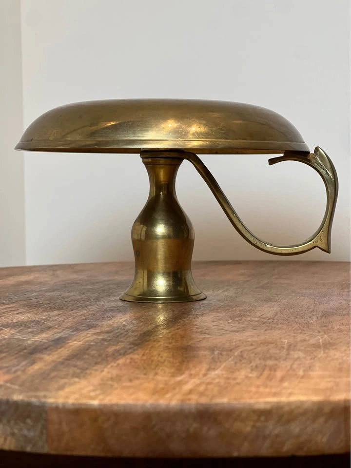Vintage solid brass chamberstick candle holder. These were historically used as portable "bed chamber" lights, featuring a wide drip pan to catch wax and a finger loop for carrying. Handcrafted in India, this piece features a classic colonial or "cottage boho" style with a flared top and a curved handle. It stands about 3.5 inches tall with a base diameter of 6 inches and is designed to hold standard taper or chime candles. Pickup is at 58th and 7th Ave in midtown Manhattan.