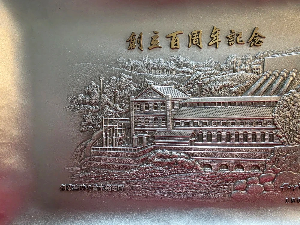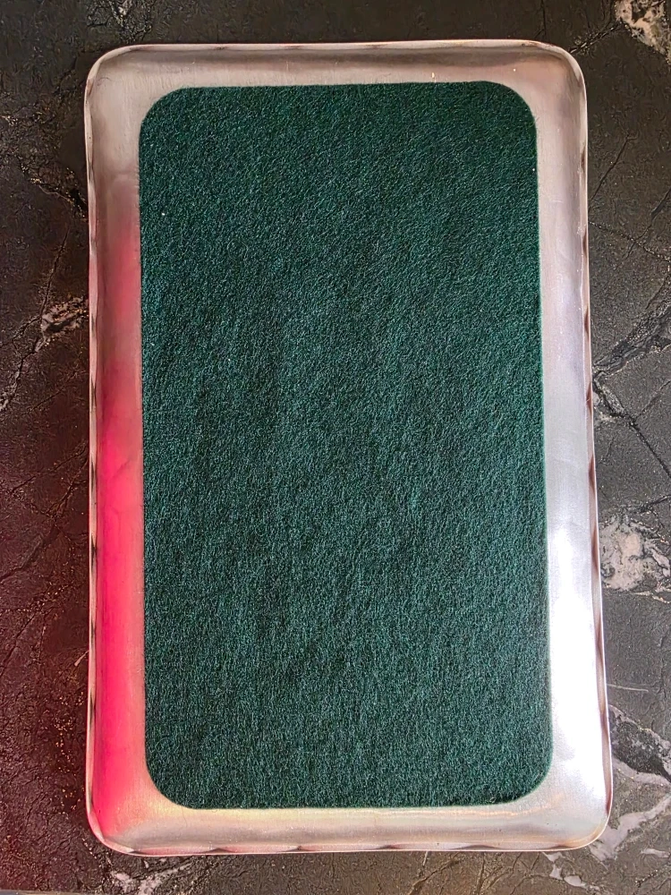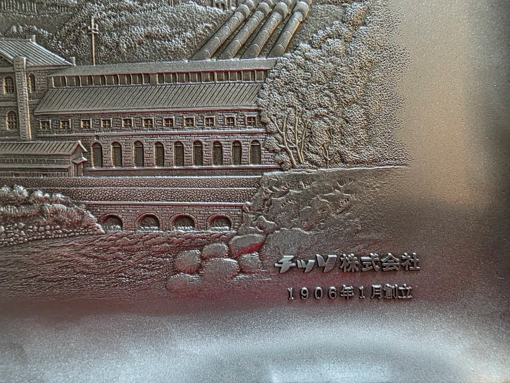 This is a commemorative tray with a detailed embossed design. It appears to depict a historical building or landmark. The tray has a silver-tone finish and a green felt backing.