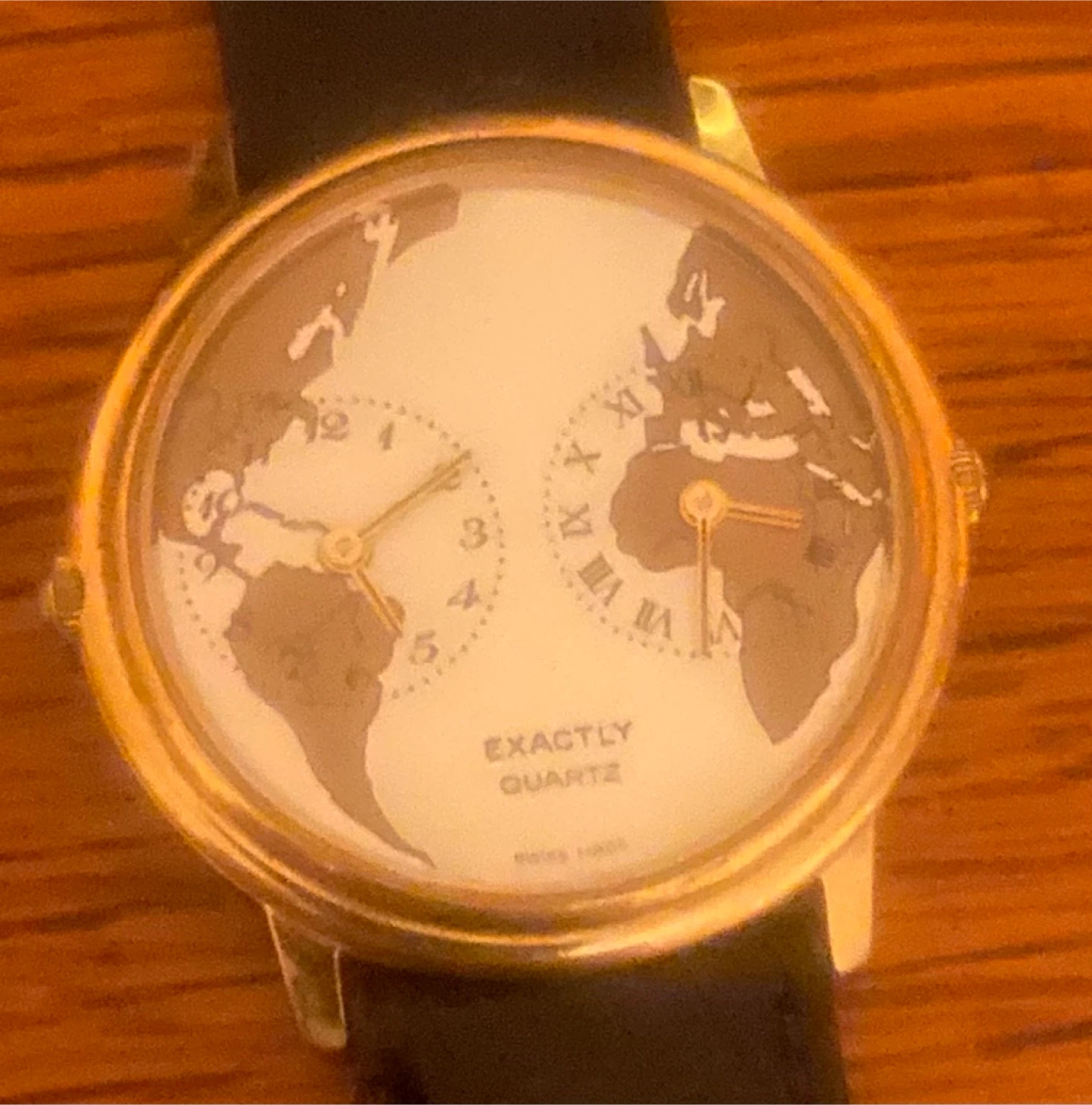 20Selling a Swiss-made Exactly Quartz watch! It has a unique world map design on the face and a stainless steel back. The band is black. It's in great condition and ready for a new owner