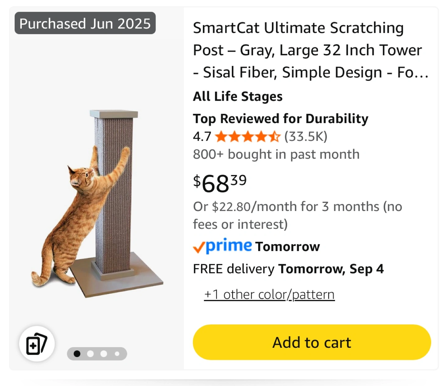 Selling a SmartCat Ultimate Scratching Post in gray! $70 on Amazon. It’s in perfect condition, bought it for my cat this summer and he just never used it (prefers scratching toys that lay flat on the floor).