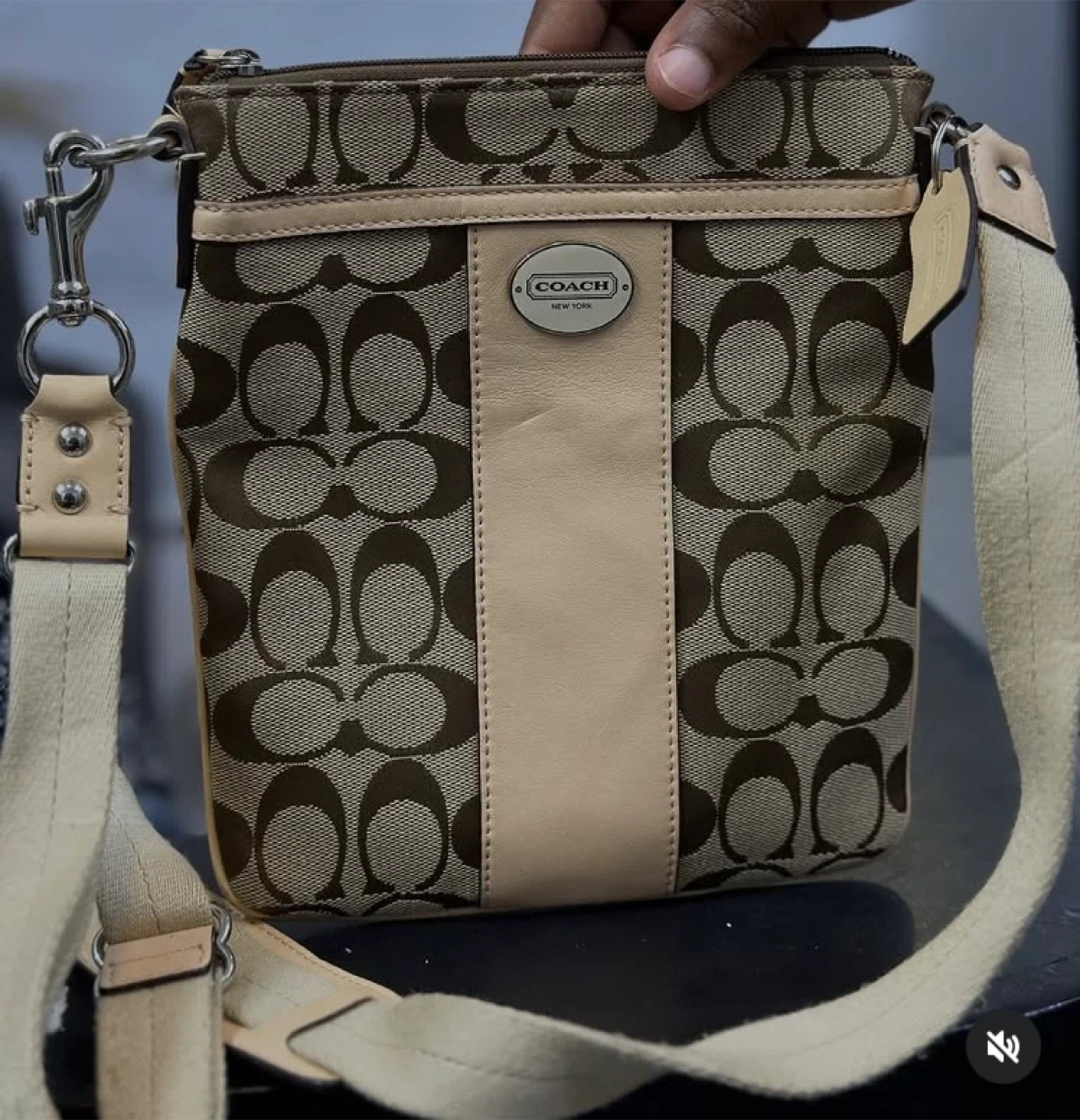 27Selling a Coach Signature Stripe Swingpack Crossbody Bag. It features the classic Coach signature pattern with a stripe detail. This bag is perfect for carrying your essentials in style! Originally bought for $255.30