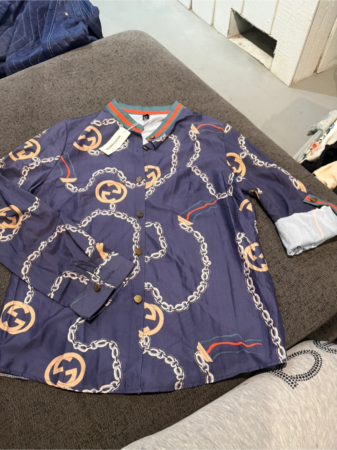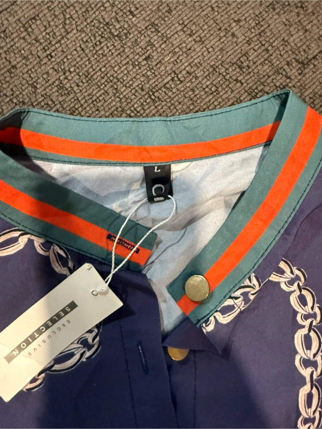 60This is a navy blue shirt from Exclusive Selection. It features a unique chain print design. The size is L.