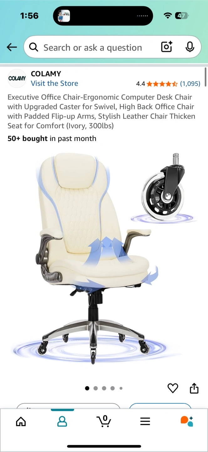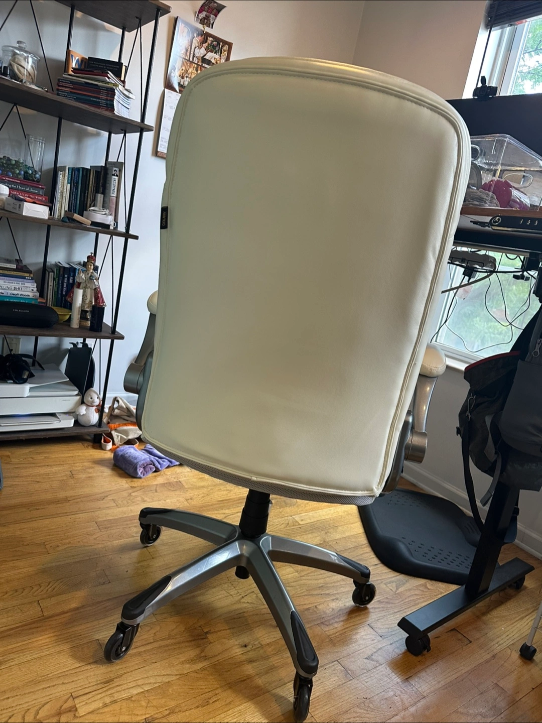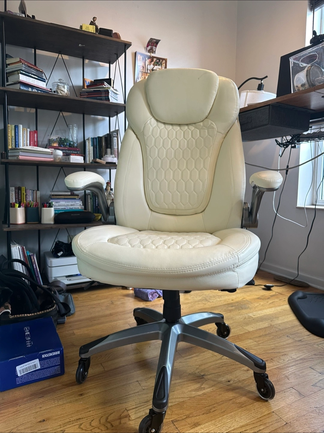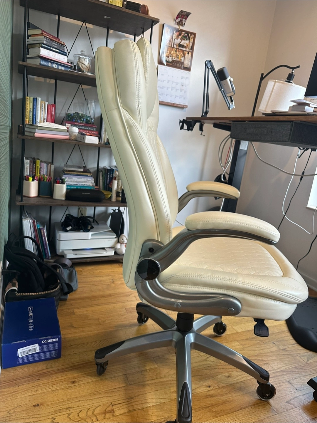 Selling a COLAMY Executive Office Chair in Ivory. It's an ergonomic computer desk chair with upgraded caster for swivel and has a high back for office chair with padded flip-up arms. The stylish leather chair has a thicken seat for comfort. Fully assembled. Only owned for 3 months. I’m moving and do not have the space for this large of a chair