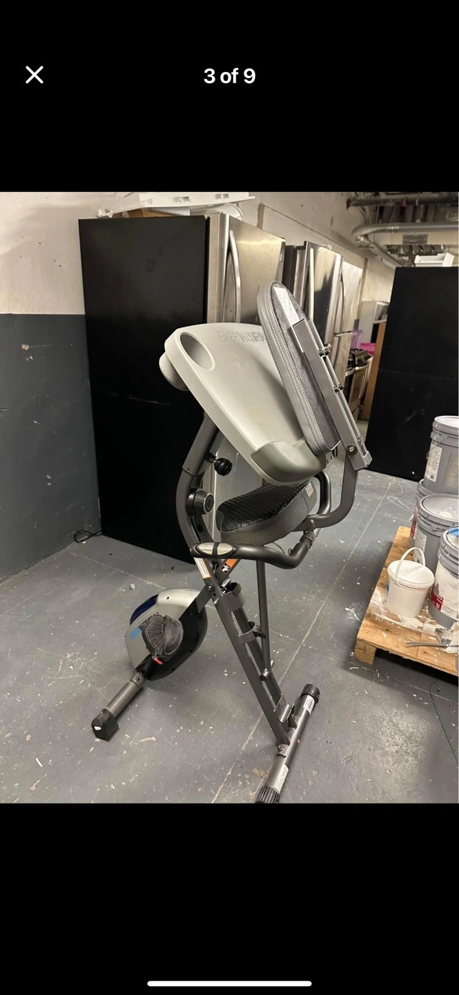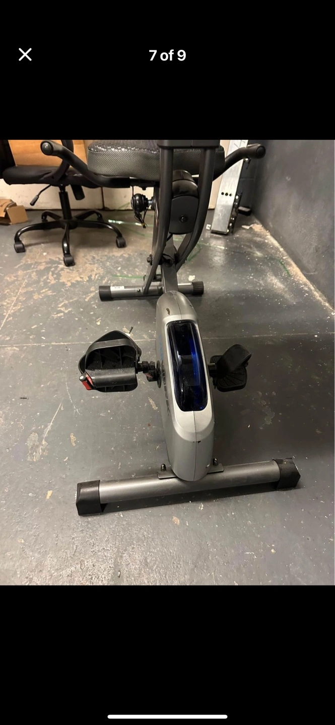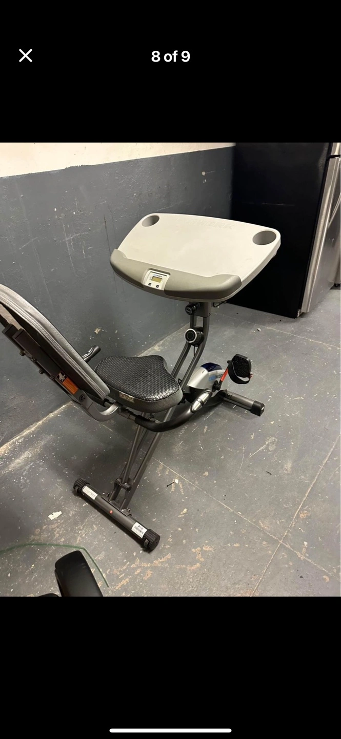 Show allFolding stationary bike with adjustable tension. Includes a desk and a comfortable padded seat.