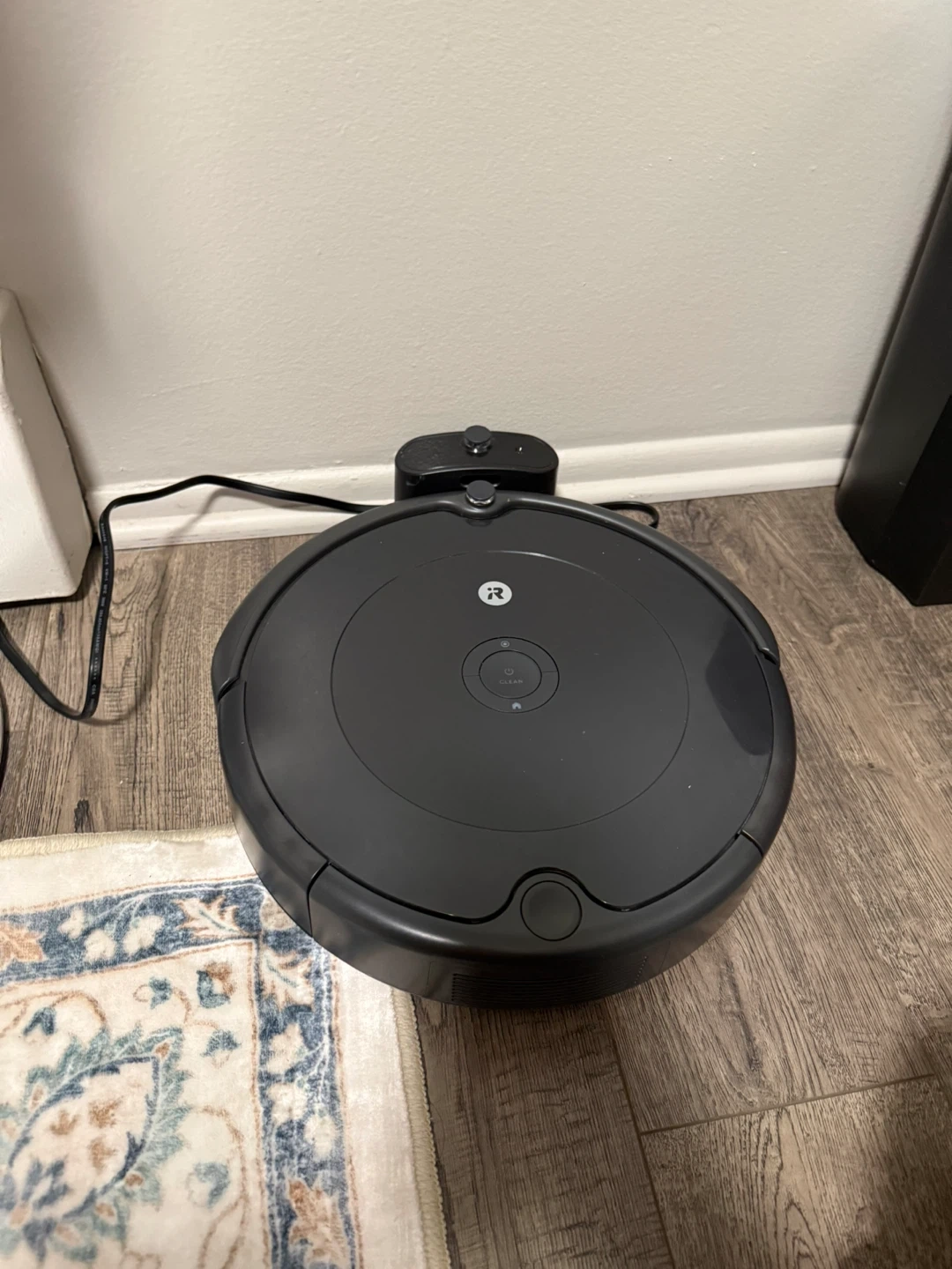 This is an iRobot Roomba robot vacuum. It's black and designed for floor cleaning. Comes with its charging base.