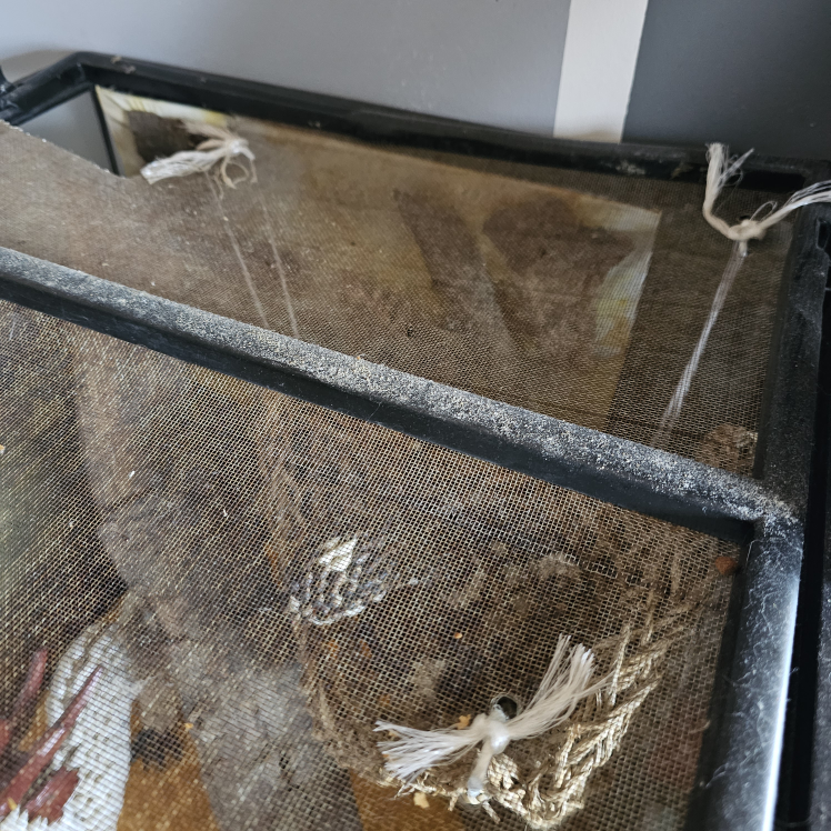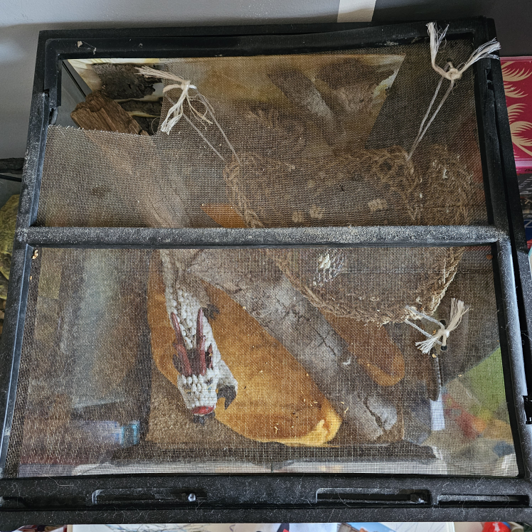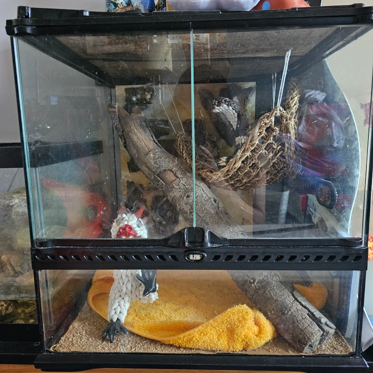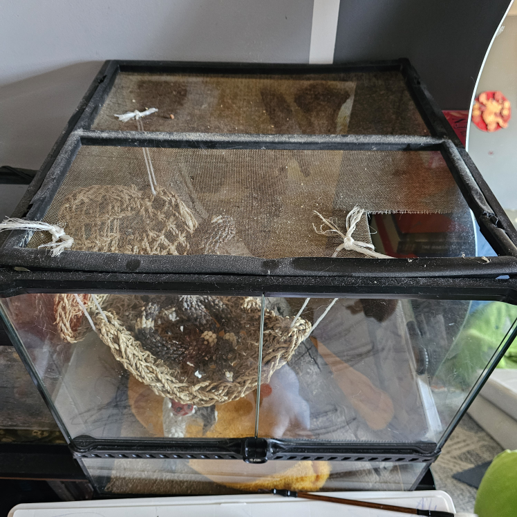 18x18x18 Exoterra terrarium. Everything works perfectly fine, including the lock mechanism. Top lid is slightly damaged, but can still close. There are little holes made on the mesh on the top lid to hang the included hammock. There is also a 2inch square cutout on one of the corners to allow your reptilian friend to climb up to a duplex apartment. That's what we did with our tanks. Lol, can't really tell in the picture with the red light, but the wooden log leads up to the hole and my bearded dragon would go up to another tank to chill or sleep. Included will be the tank with the lid, hammock, custom glued background with real wooden pieces that are glued on, real wooden log center piece, and the dessert floor mat.