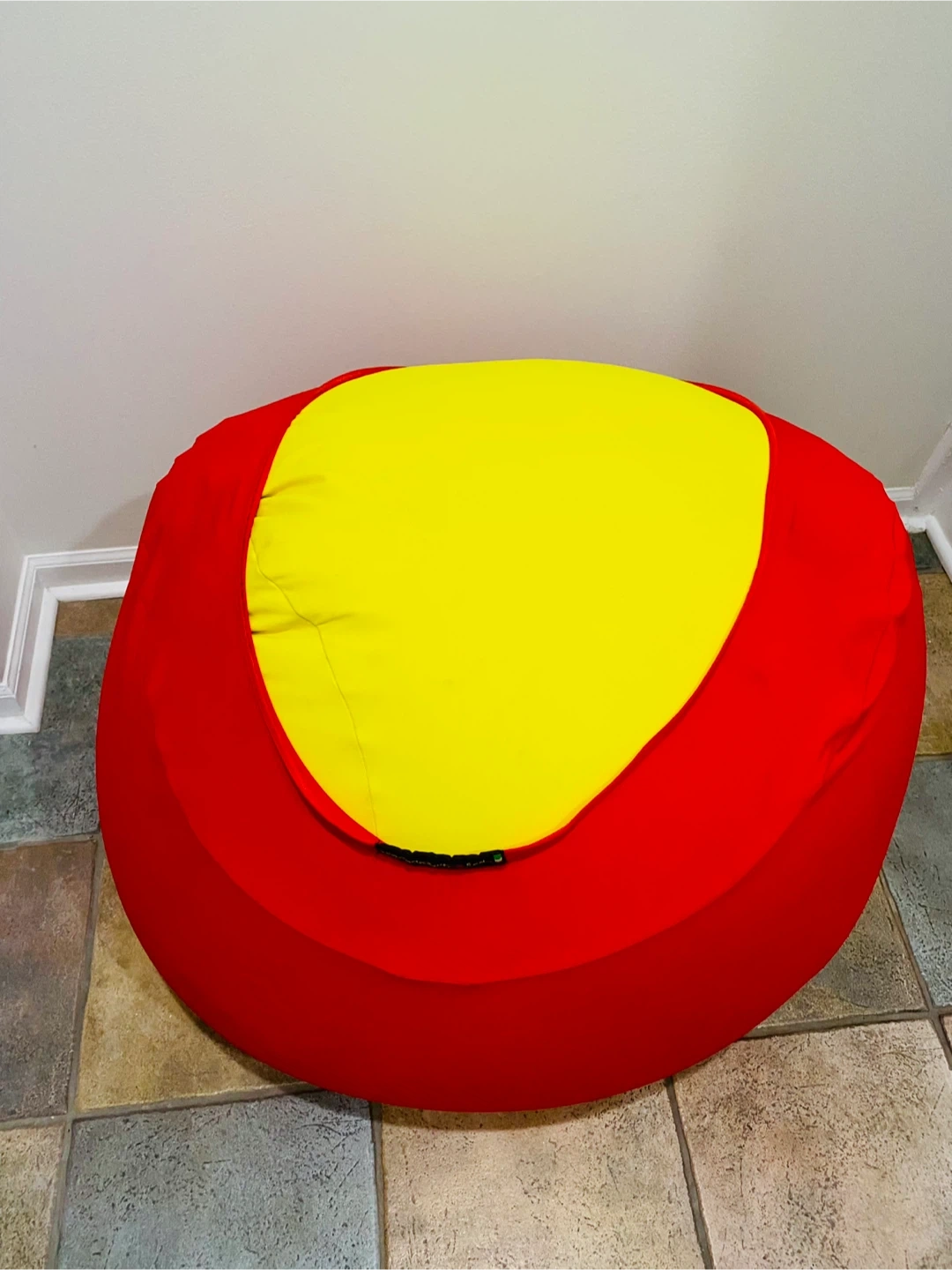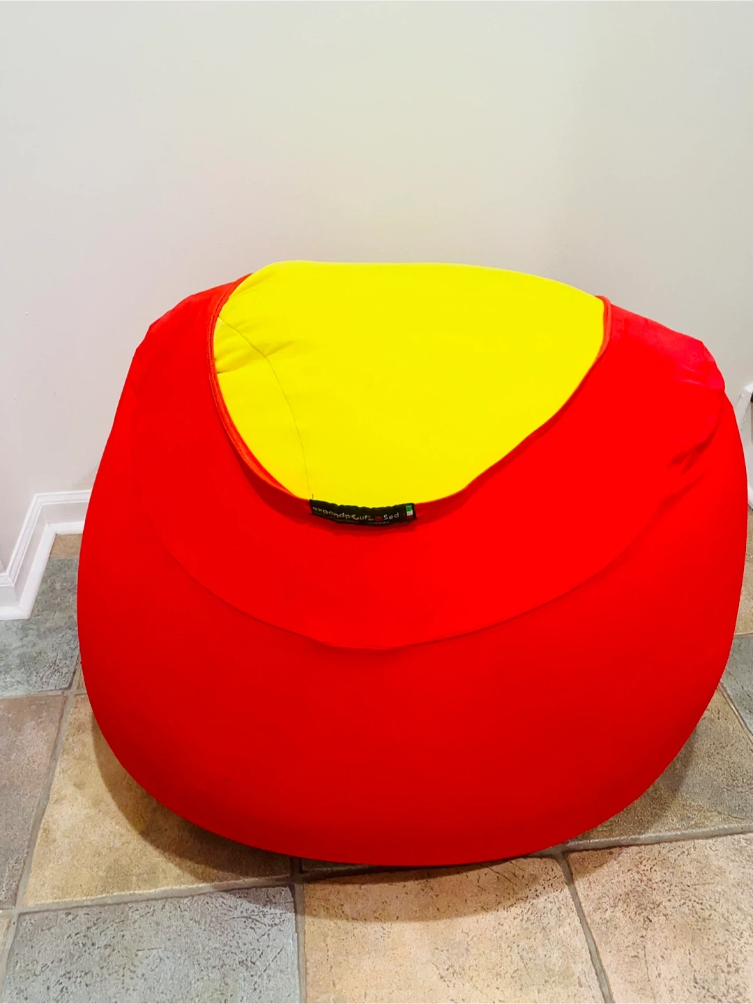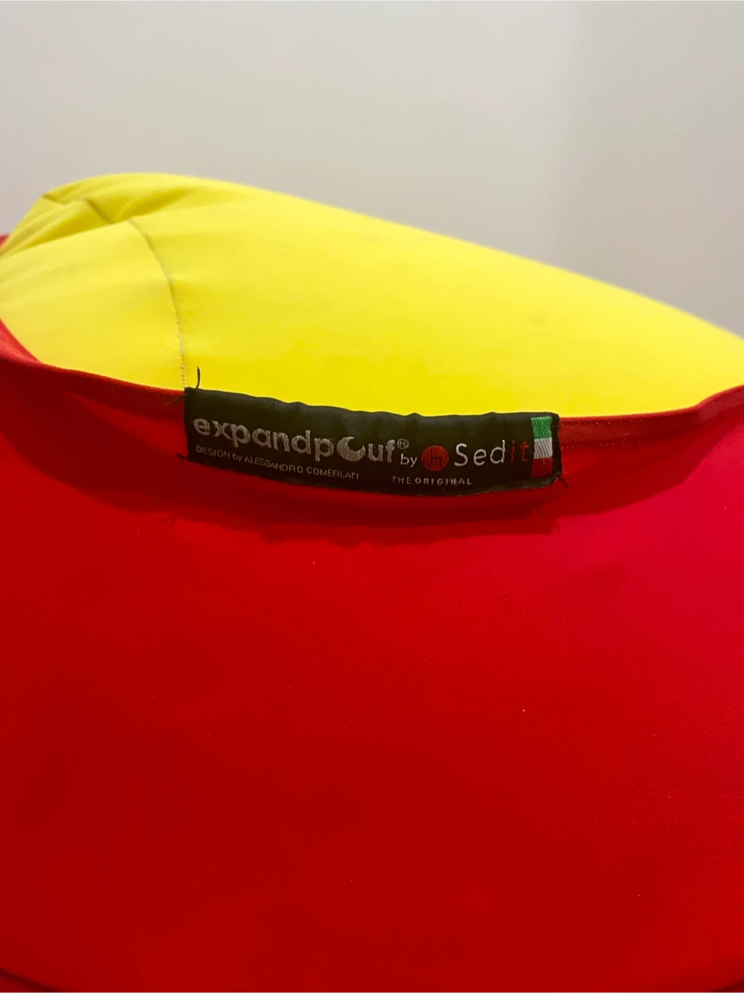 Selling a fun and comfy Expandpouf by Sedit beanbag chair! It features a vibrant red and yellow color scheme that's sure to brighten up any room. This beanbag is perfect for relaxing and lounging around