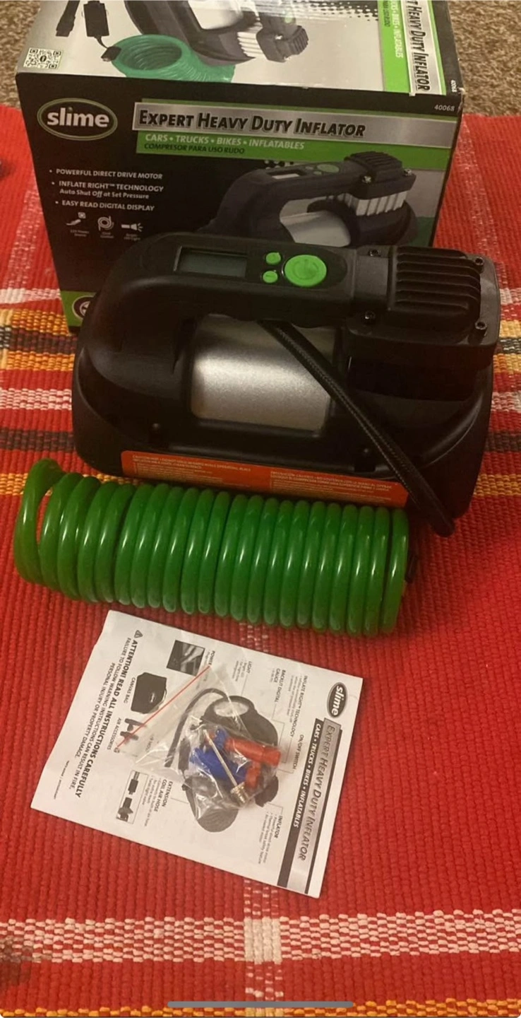 An expert heavy-duty inflator with a green coil hose, accessories, and a user manual. It looks capable of inflating various items. Having this in the car will help keep you at ease.