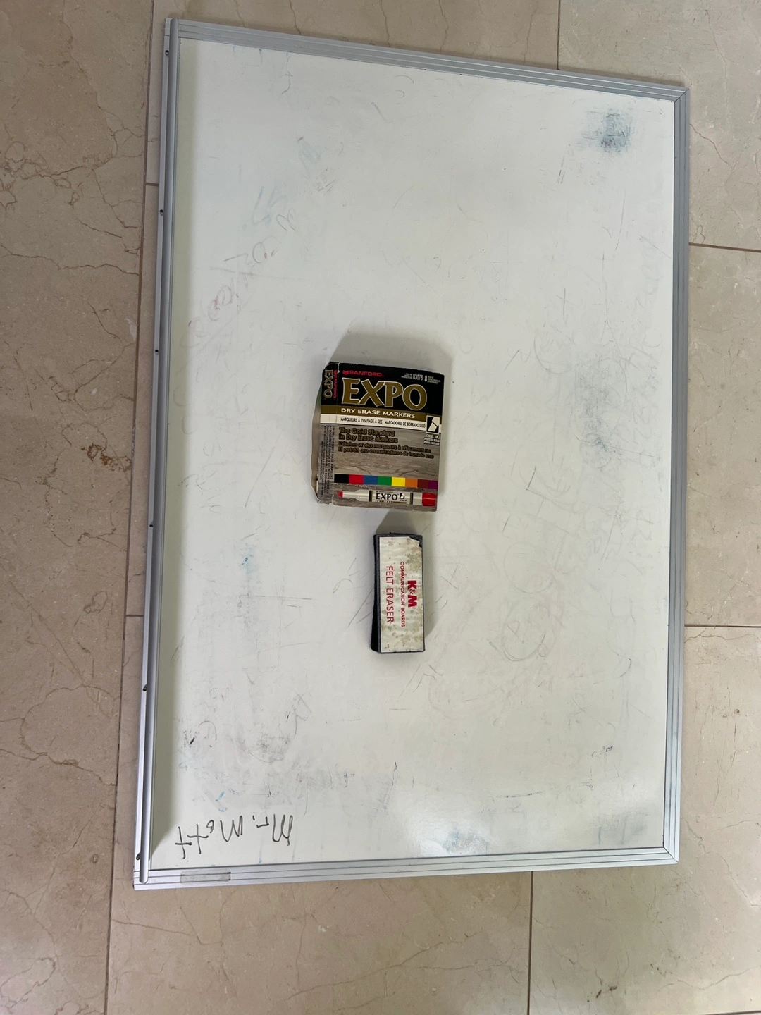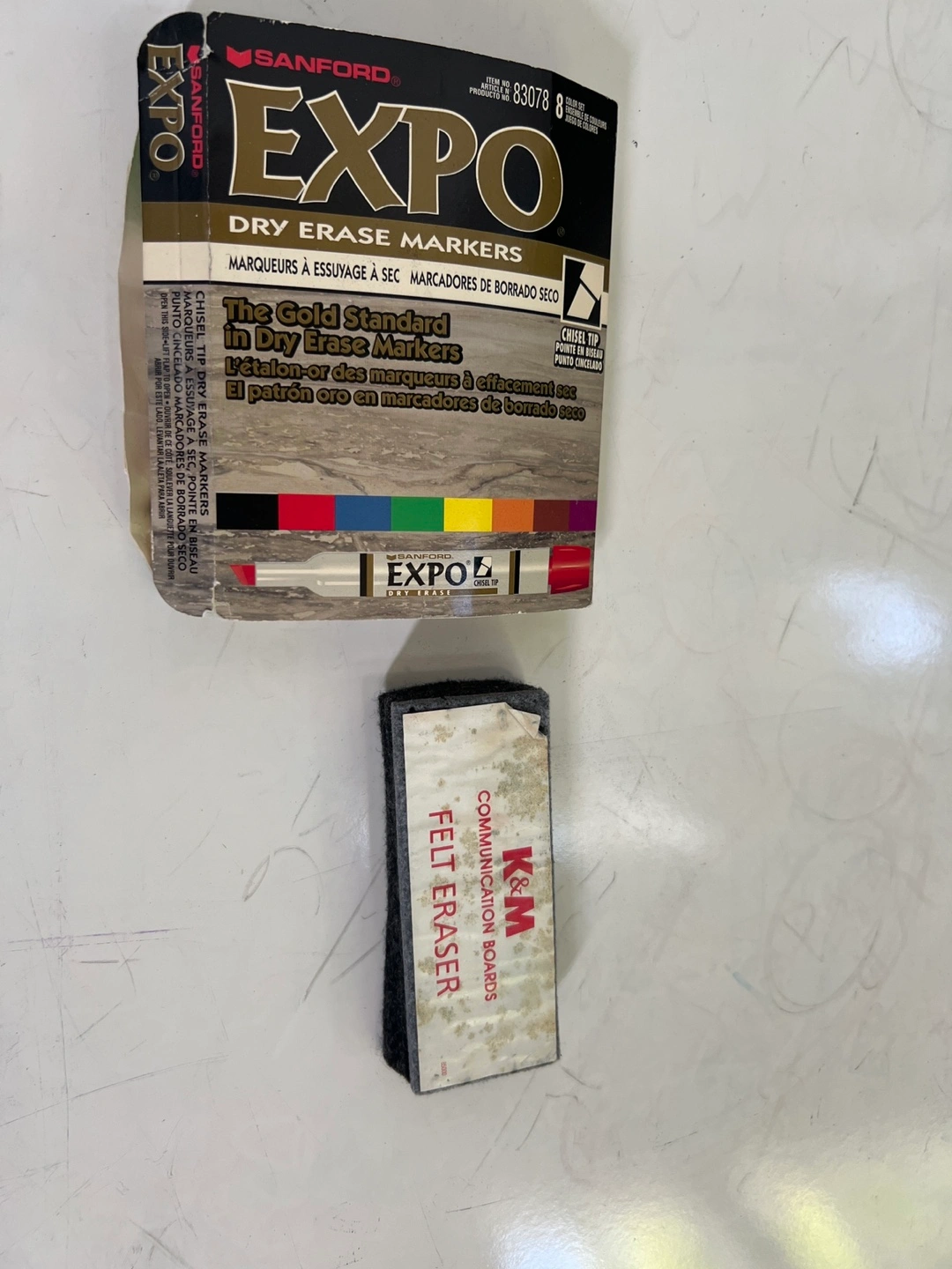 Selling a set of EXPO dry erase markers, including a variety of colors! Also included is a K&M Communication Boards felt eraser to keep your whiteboard clean and ready for new ideas. It has some stains see fotos. Otherwise in good conditions