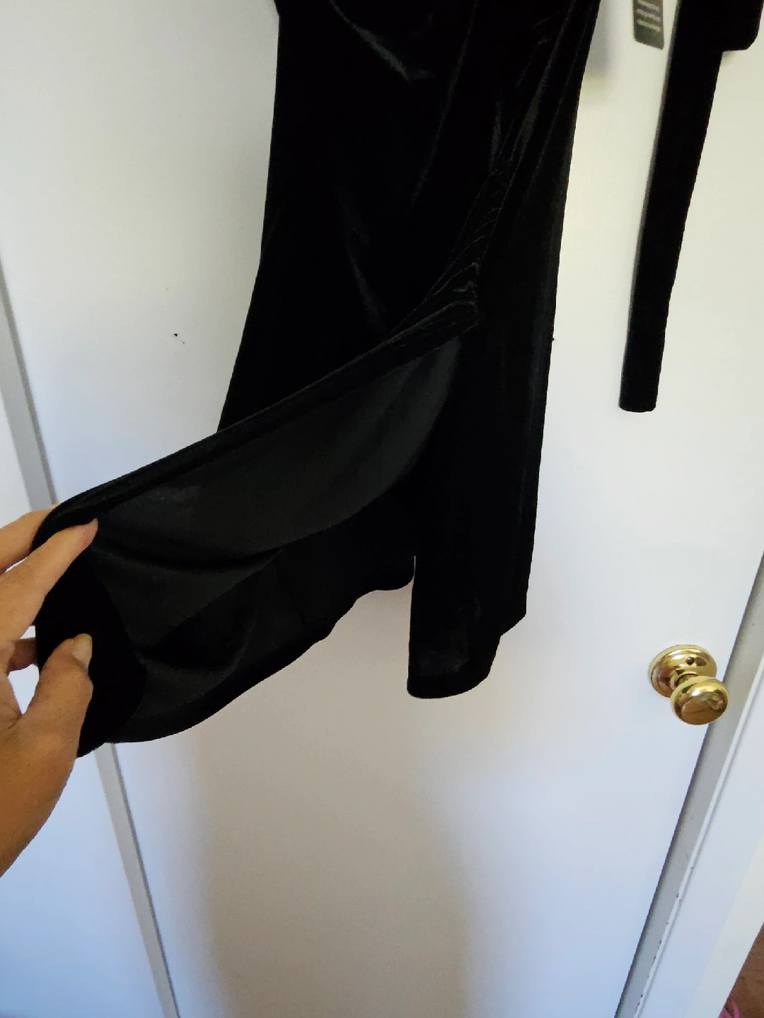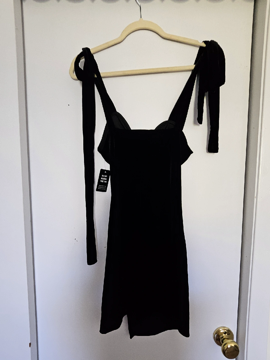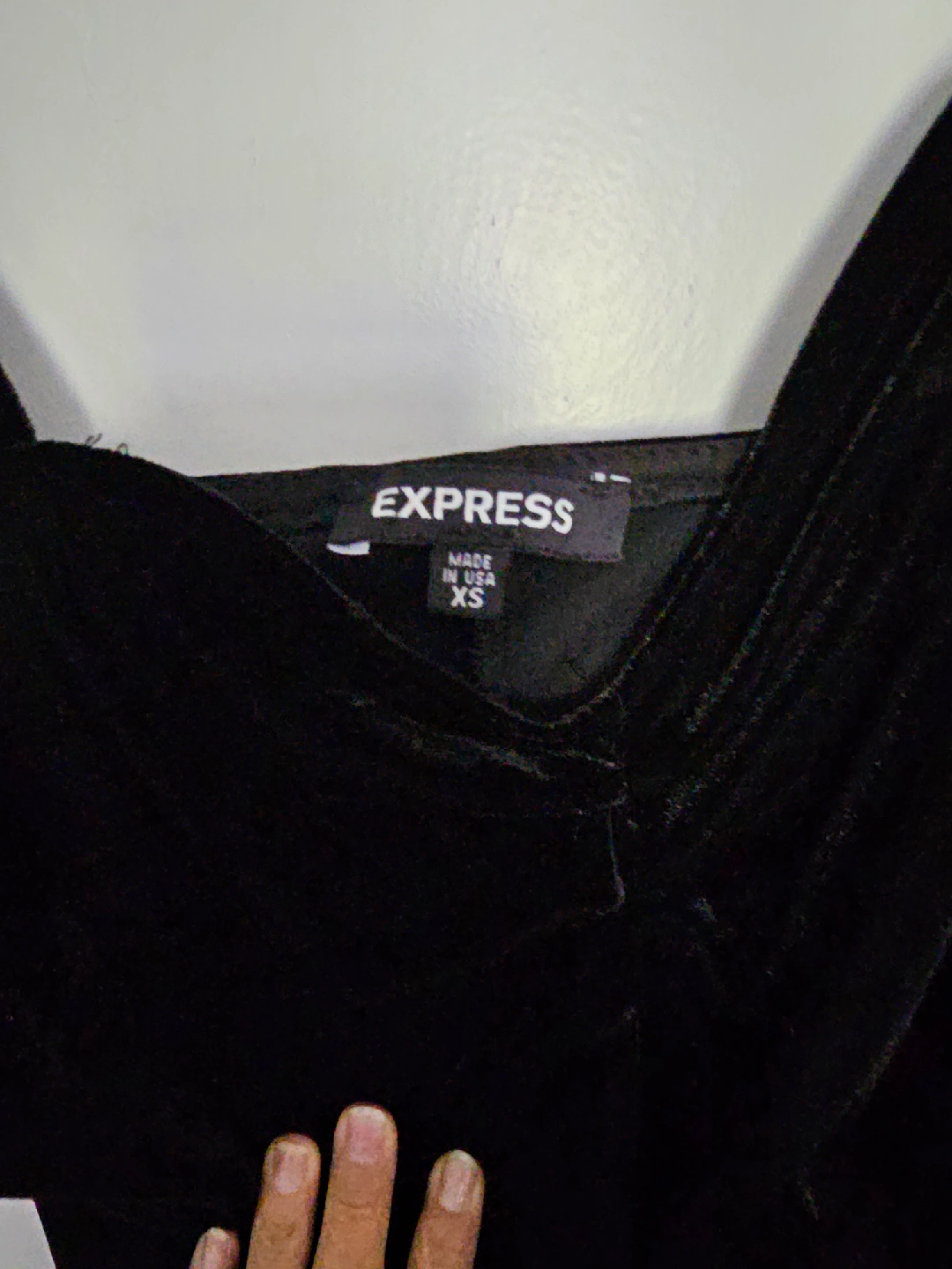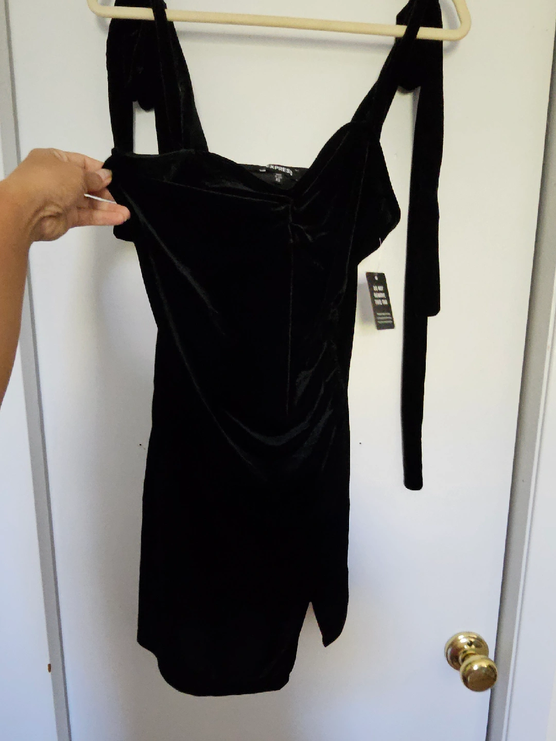 65Selling a cute black velvet mini dress from Express! It's a size XS and features tie straps. Perfect for a night out or special occasion. The dress has a stylish slit on the side.