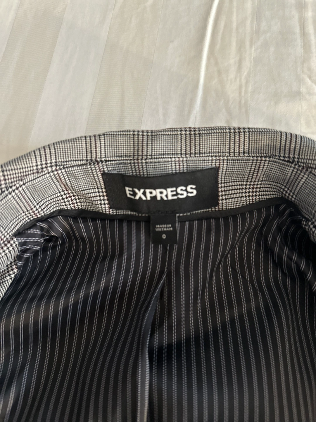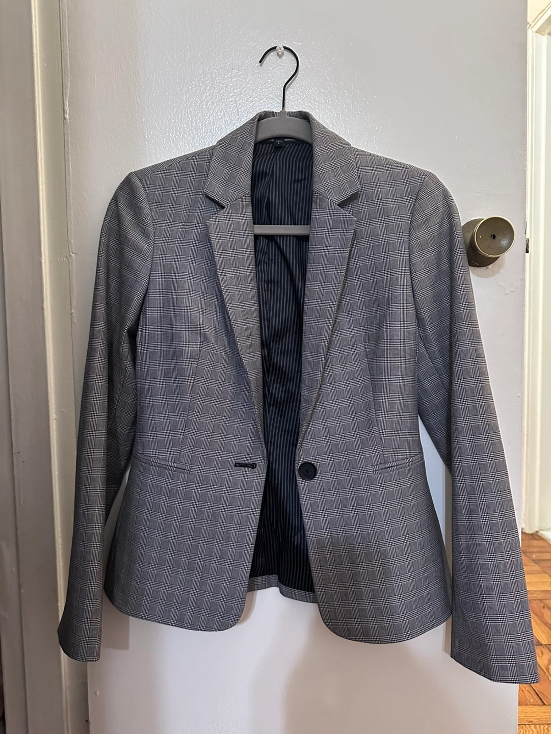 240Women's gray plaid blazer. Size 0. One button closure. Long sleeves. Excellent for work or special occasions.