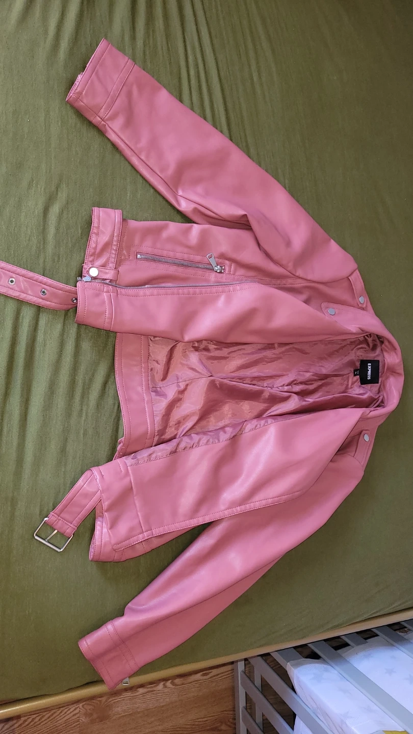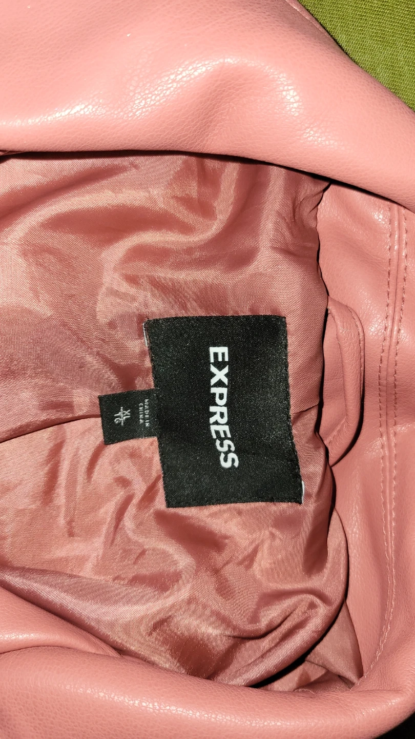 15Selling a beautiful Express faux leather jacket in a lovely pink color. It's a size XL and in great condition. Perfect for adding a pop of color to your wardrobe!