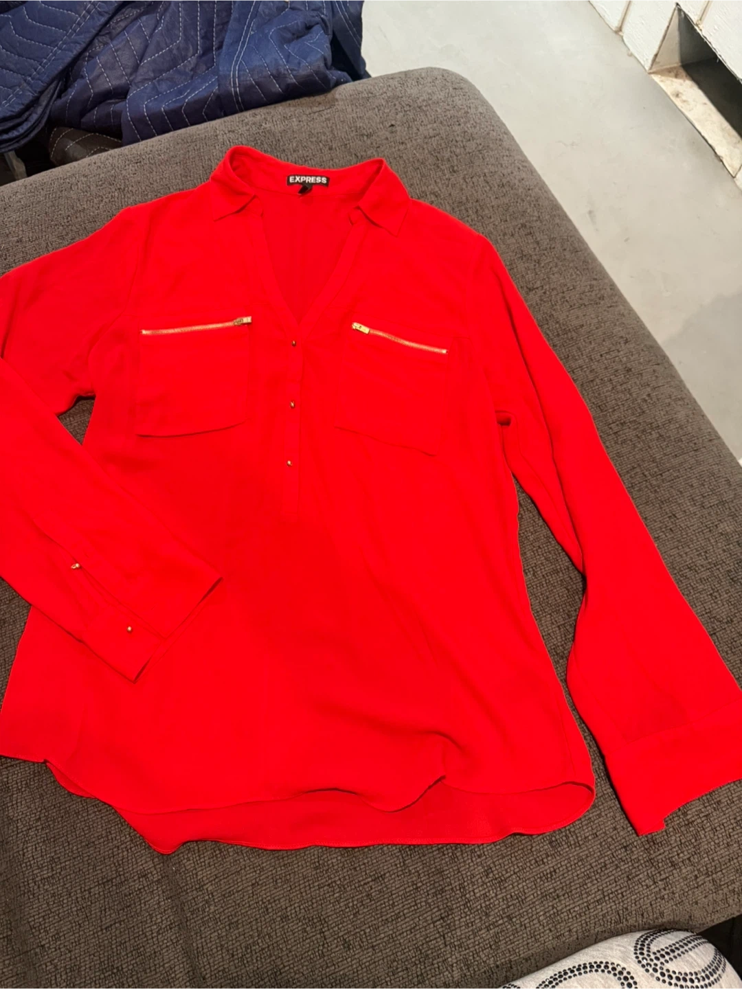 60Bright red Express blouse in size medium! It has a v-neck and long sleeves. The blouse also has gold zipper details on the front pockets, adding a touch of style to the vibrant color
