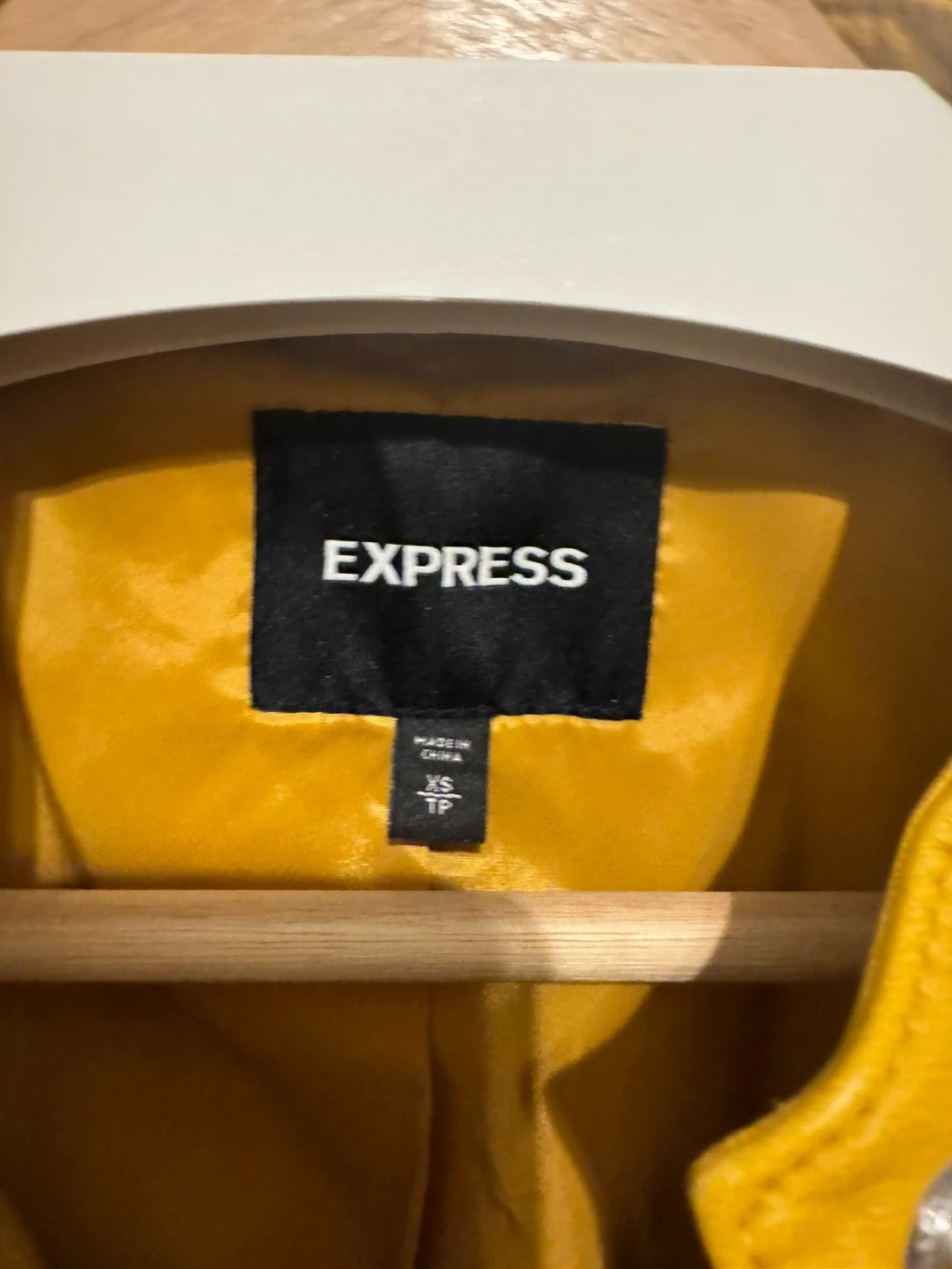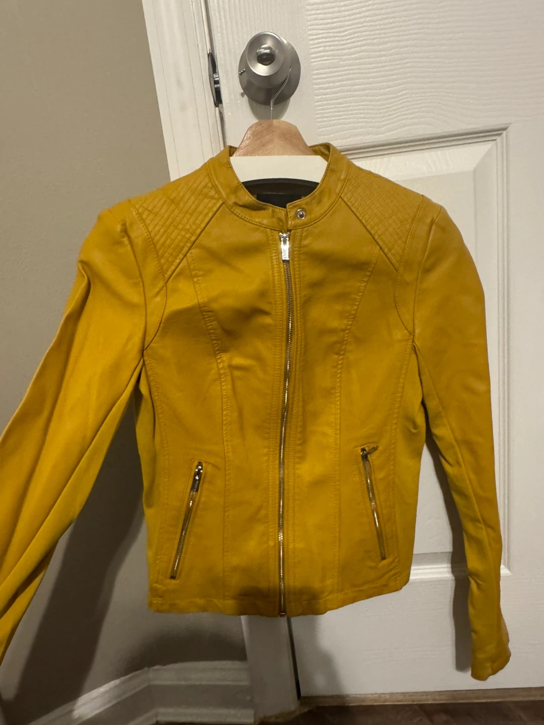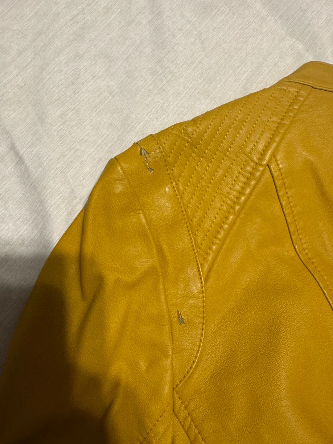 10Selling a cute Express faux leather jacket in size XS. It's a vibrant yellow color! Please note there are some small imperfections as shown in the photos