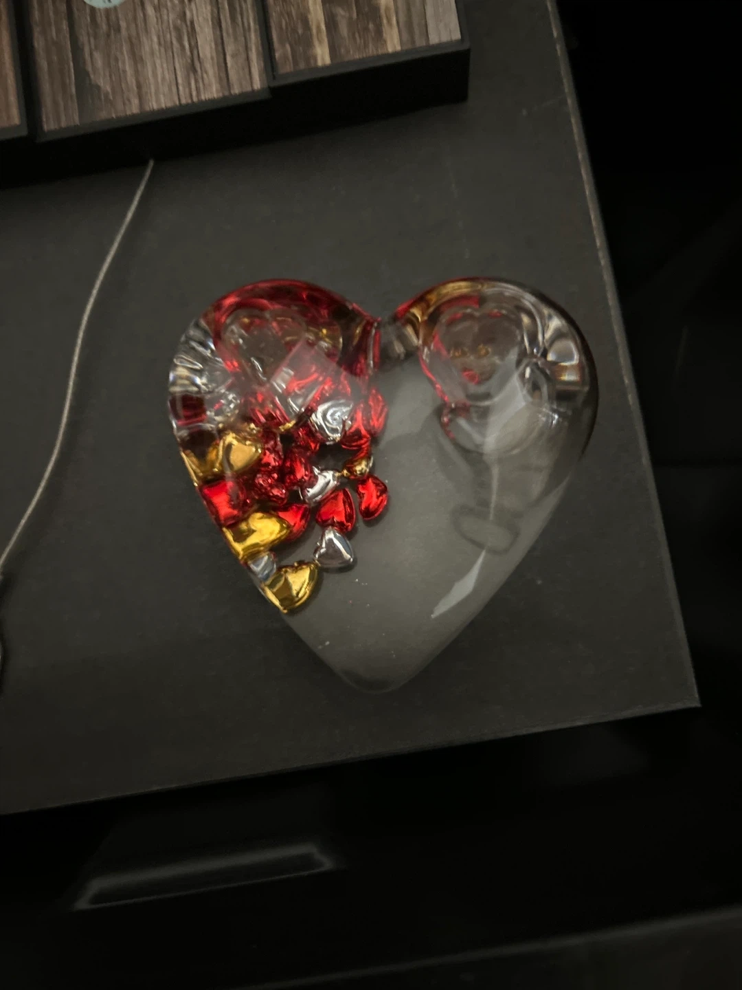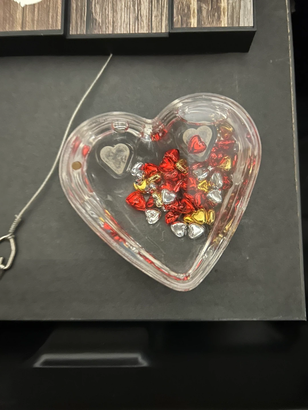 Selling a cute heart-shaped glass decoration! It's filled with tiny red, gold, and silver hearts. Perfect for adding a little love to any space