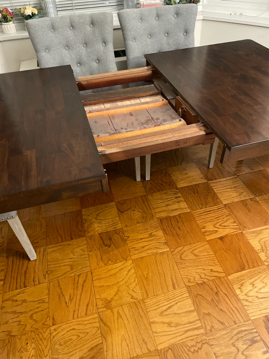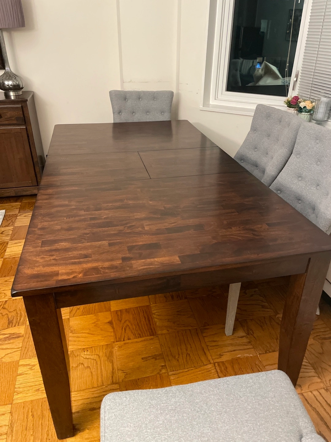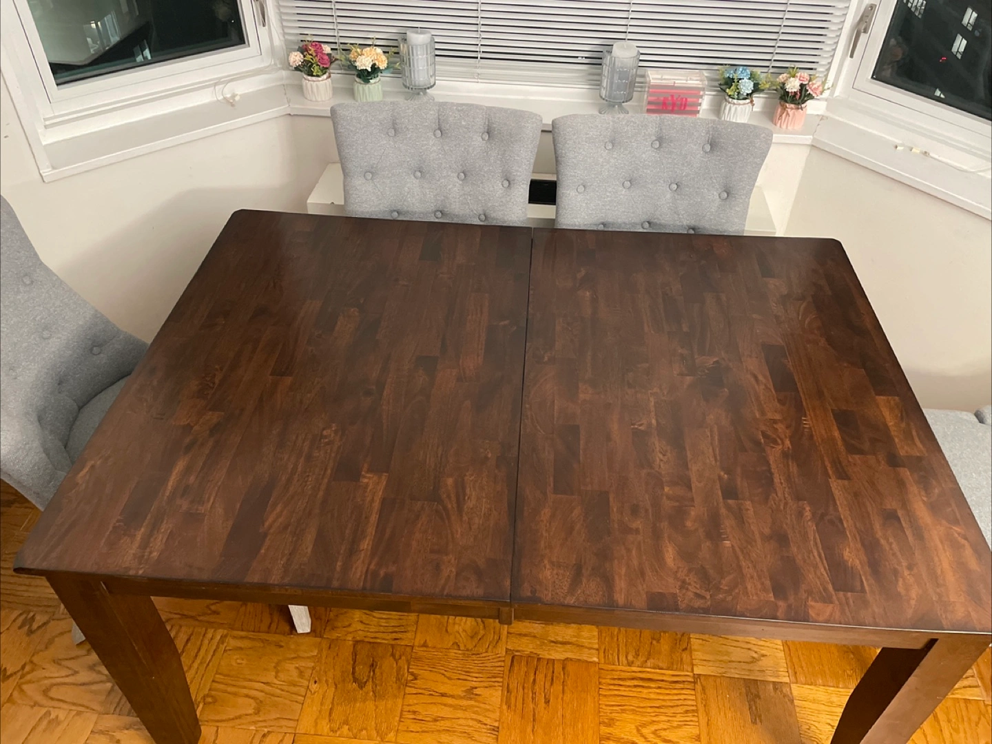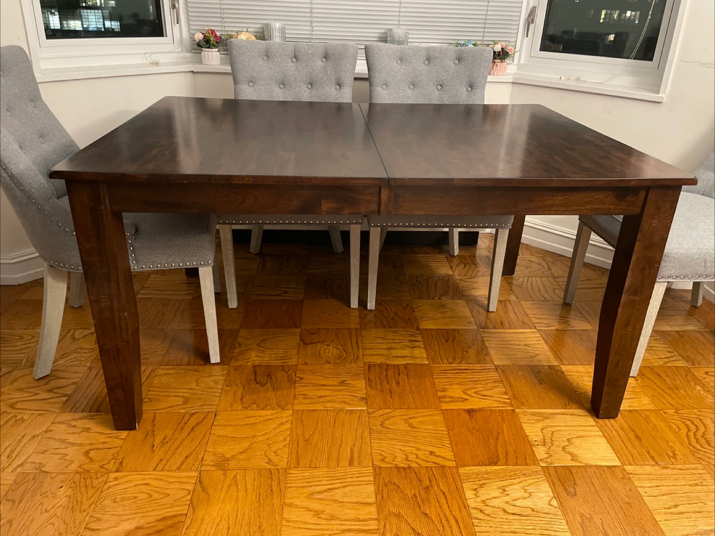 I'm selling a dark wood dining table that can be extended with a leaf that is stored inside the table. It's in great condition and perfect for family dinners or gatherings! Closed seats 6 comfortable. Open fully seats 8 comfortable.