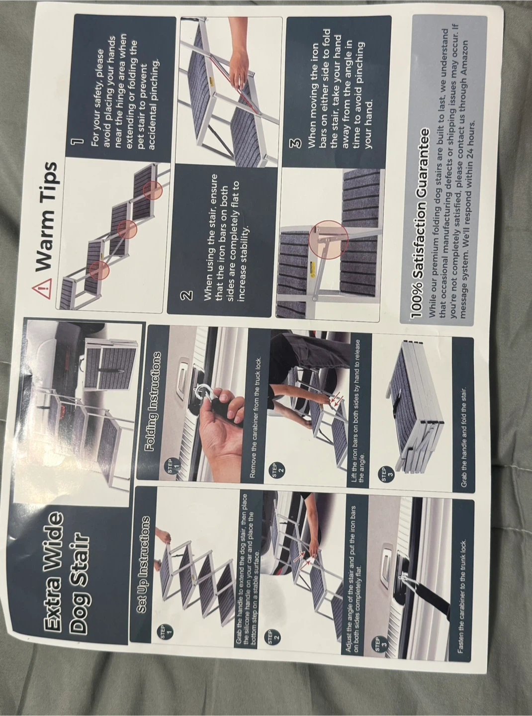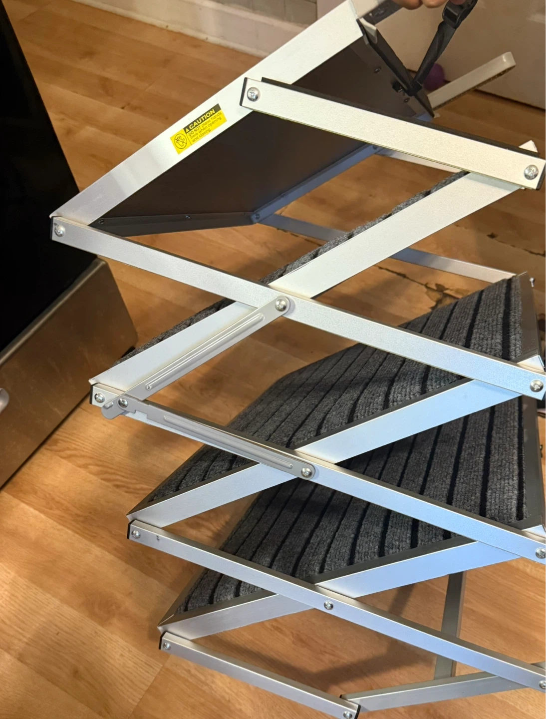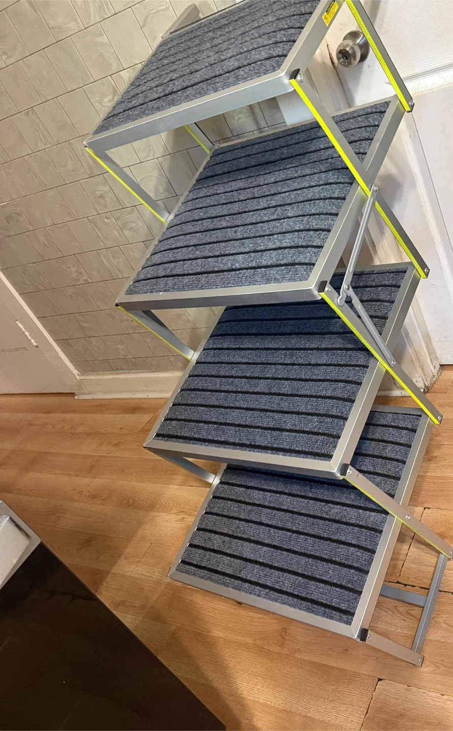 Selling an extra wide dog stair! It's in great condition and ready to help your furry friend reach new heights! The stair folds for easy storage and transport, and the carpeted steps provide a secure grip