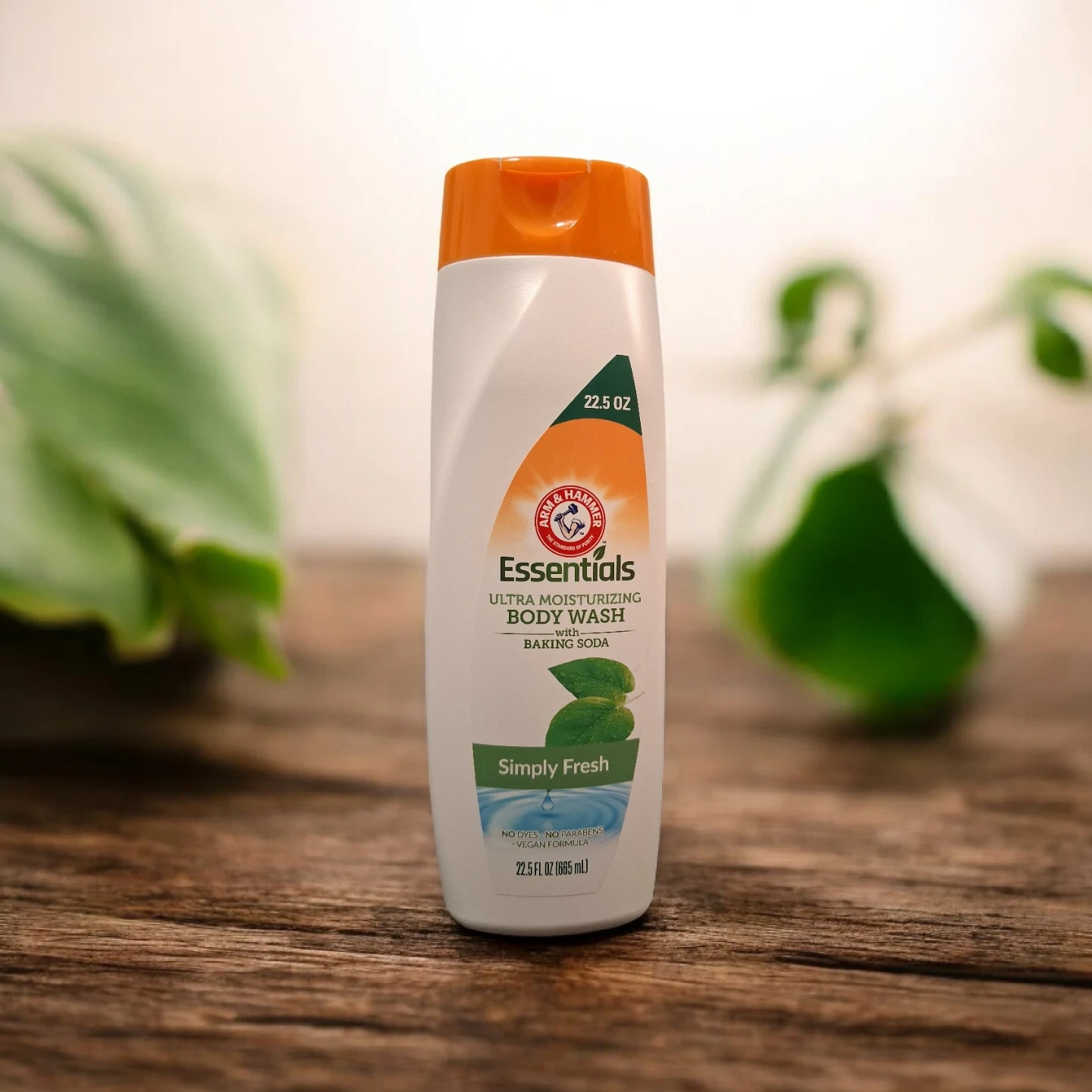 Arm & Hammer Essentials Ultra Moisturizing Body Wash in Simply Fresh scent. It's a vegan formula with no dyes or parabens. 22.5 fl oz (665 mL). Six bottles are available for $2.50 each.