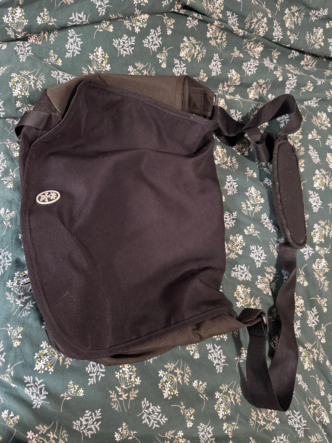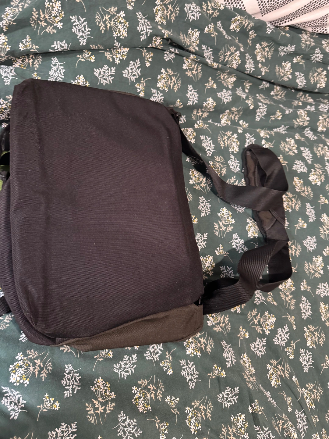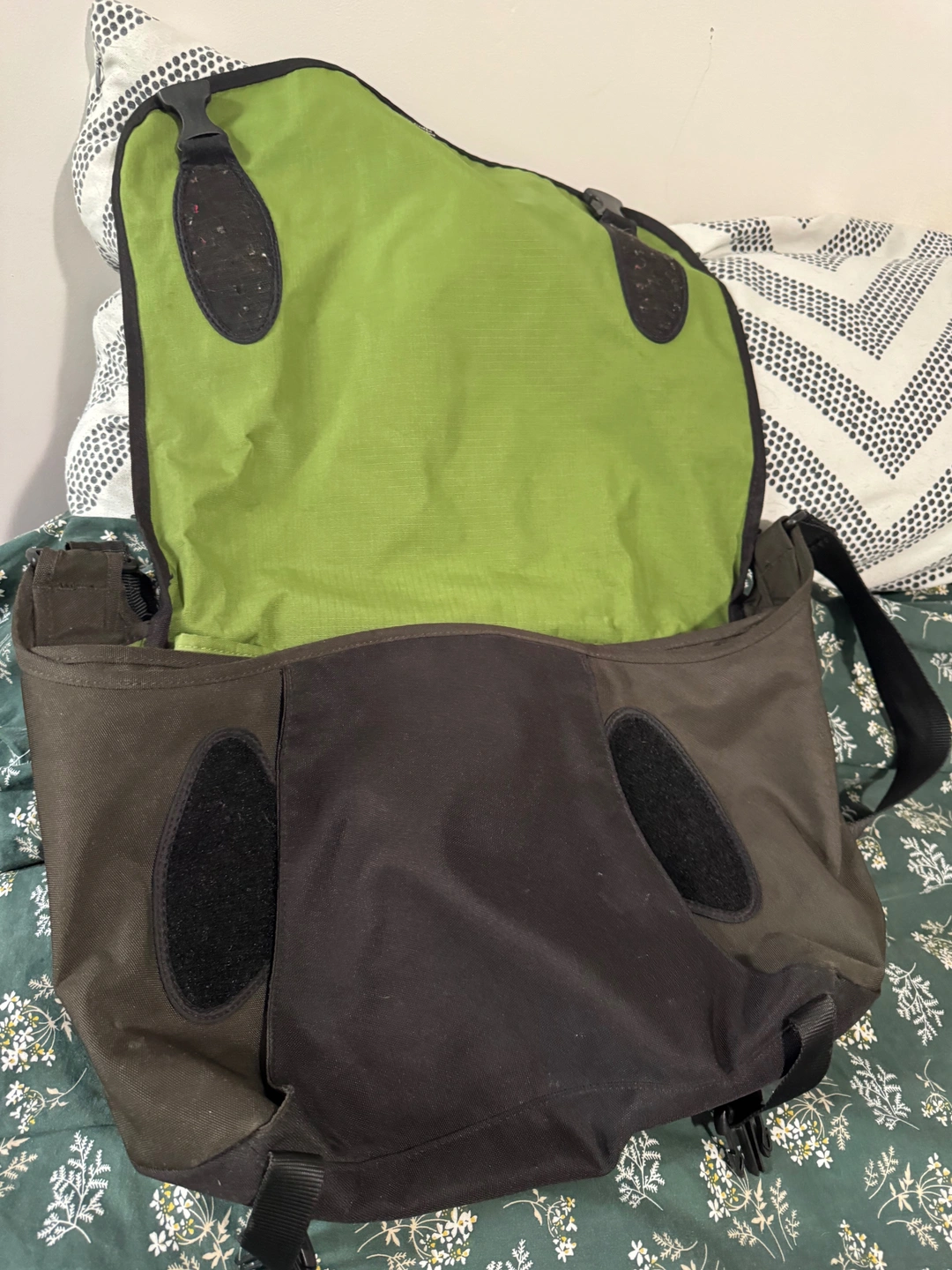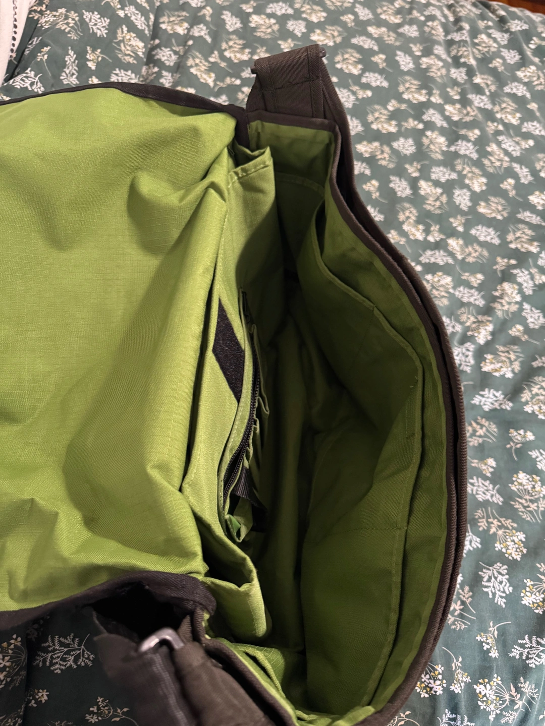 Selling a black messenger bag with a green interior! It has multiple compartments and a sturdy shoulder strap. It's in great condition and ready for a new home!