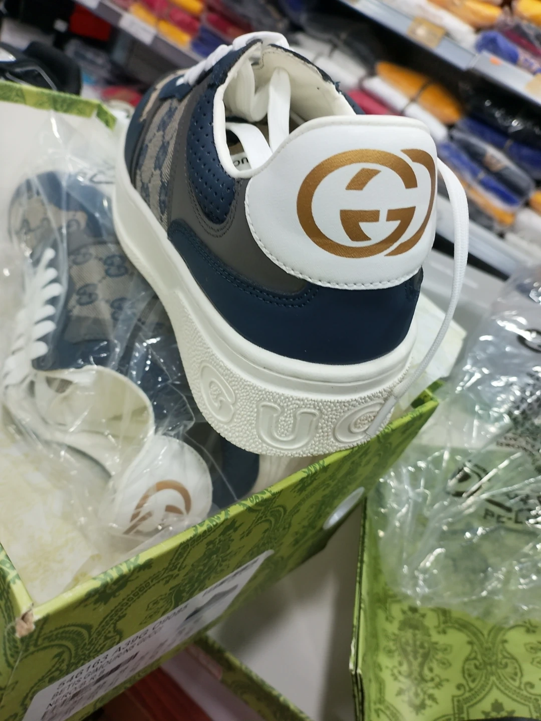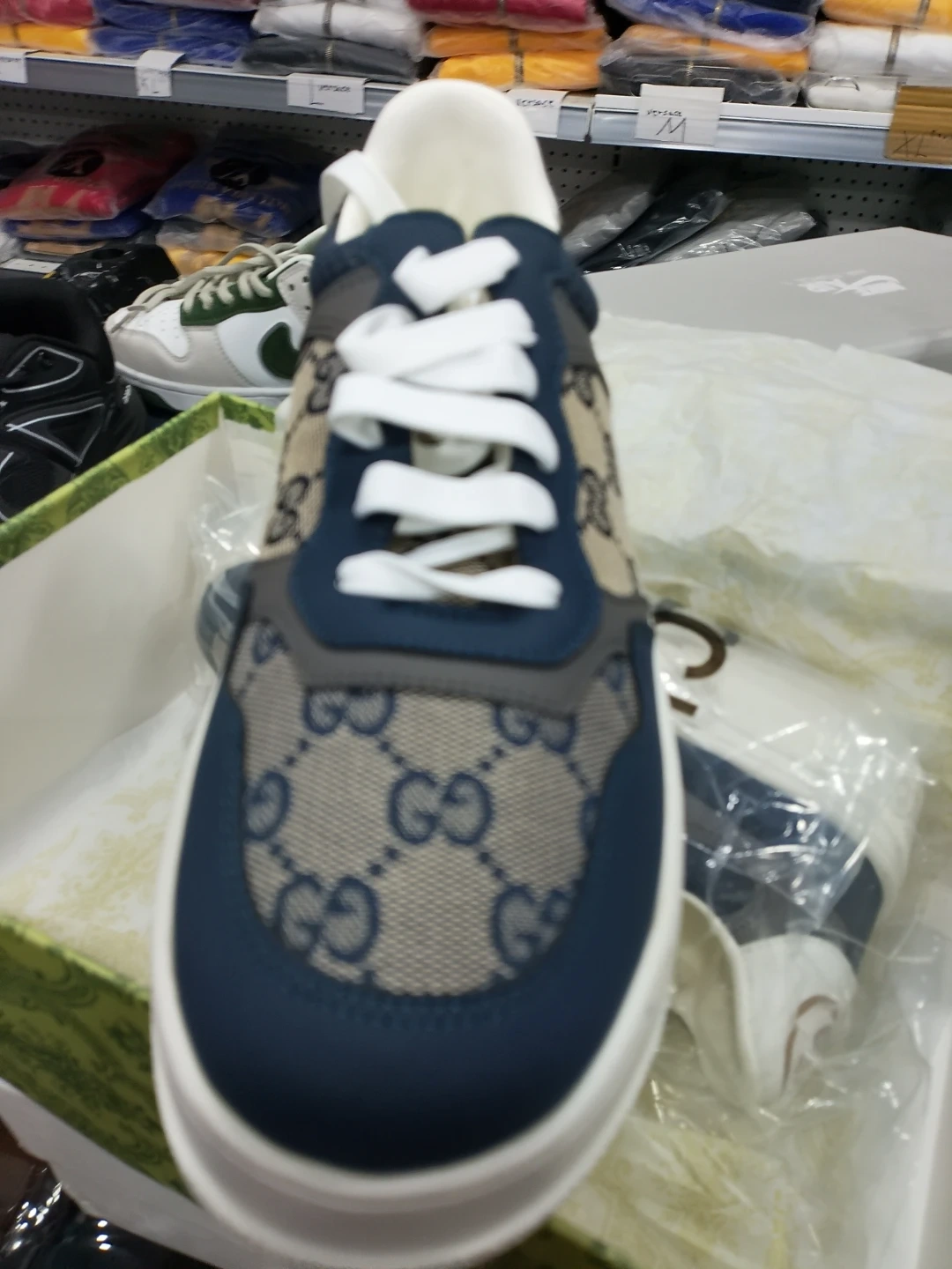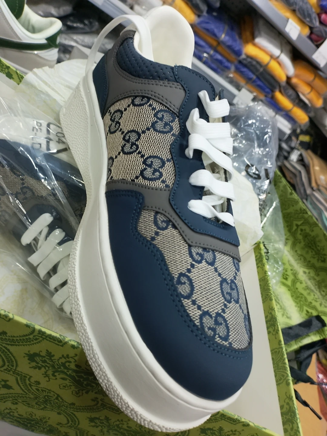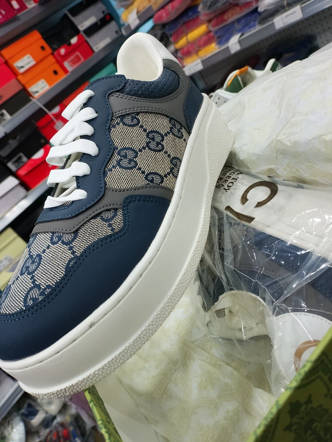 These Gucci sneakers feature the iconic GG monogram pattern. They're made with a blue and grey leather and canvas upper with a white rubber sole. Comes in original packaging.