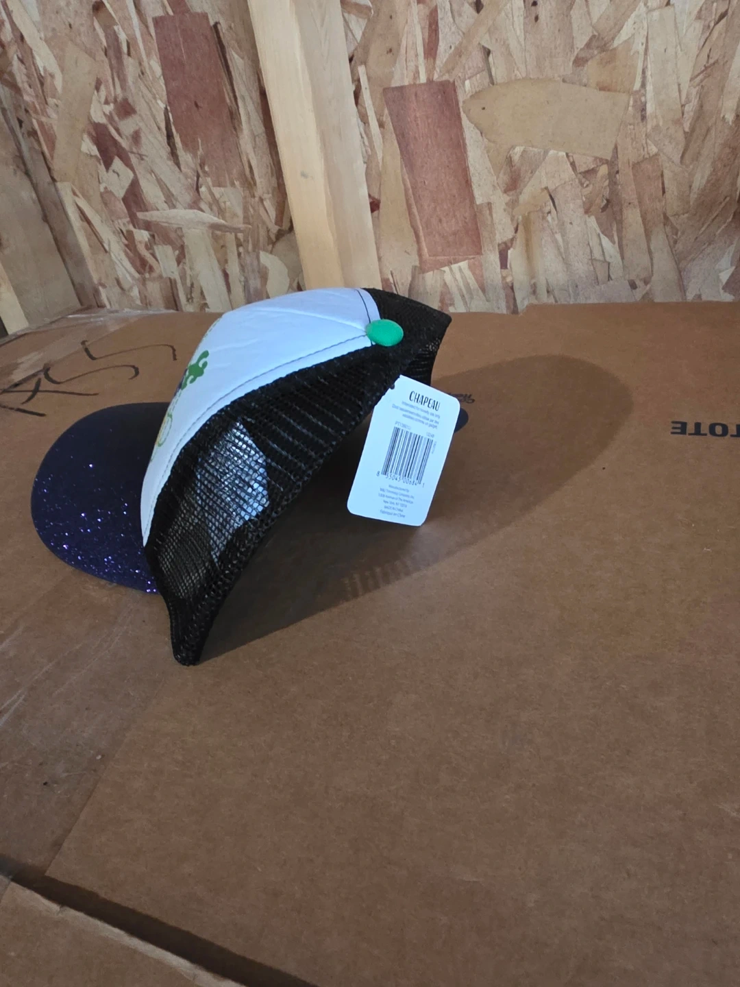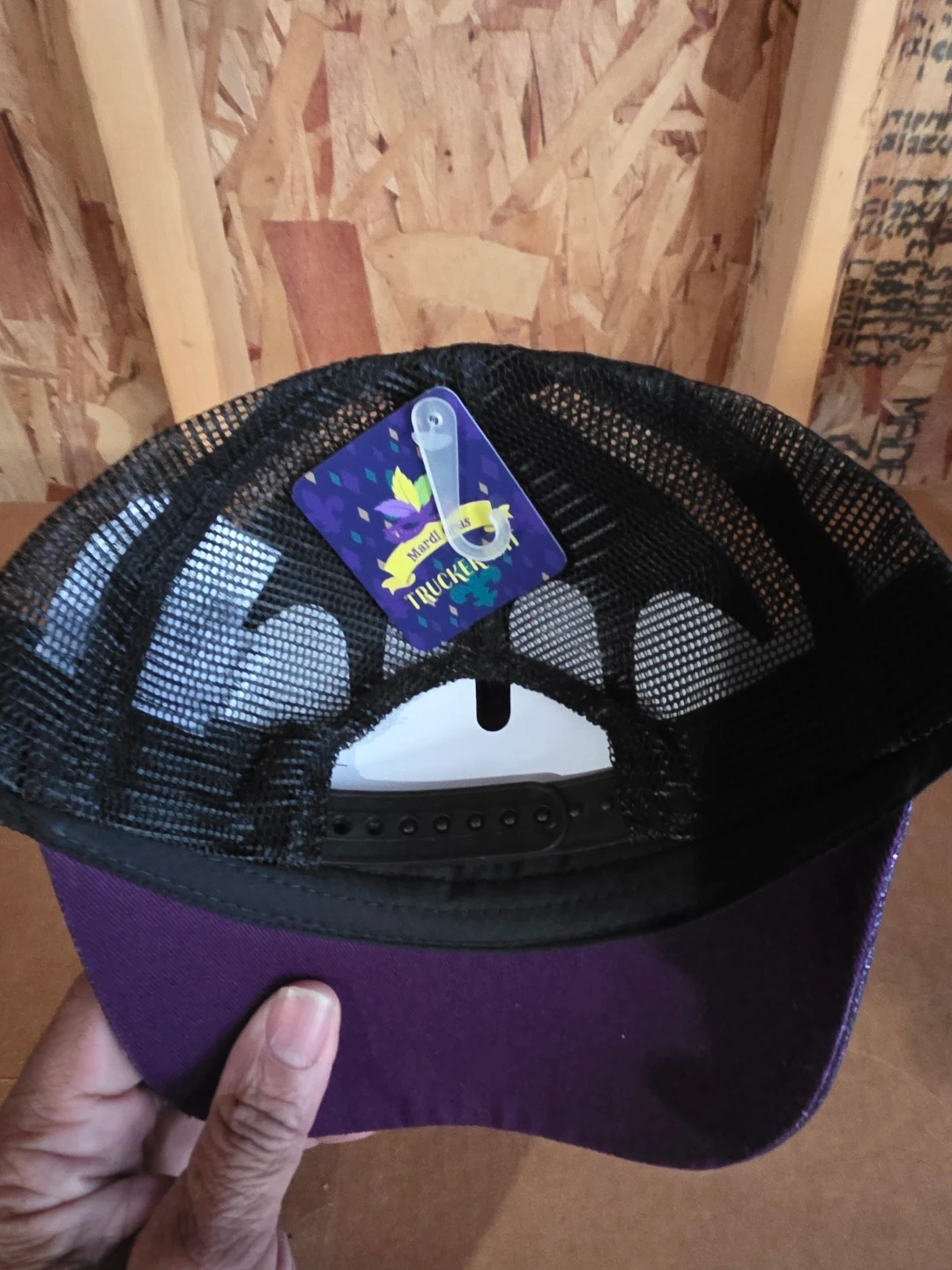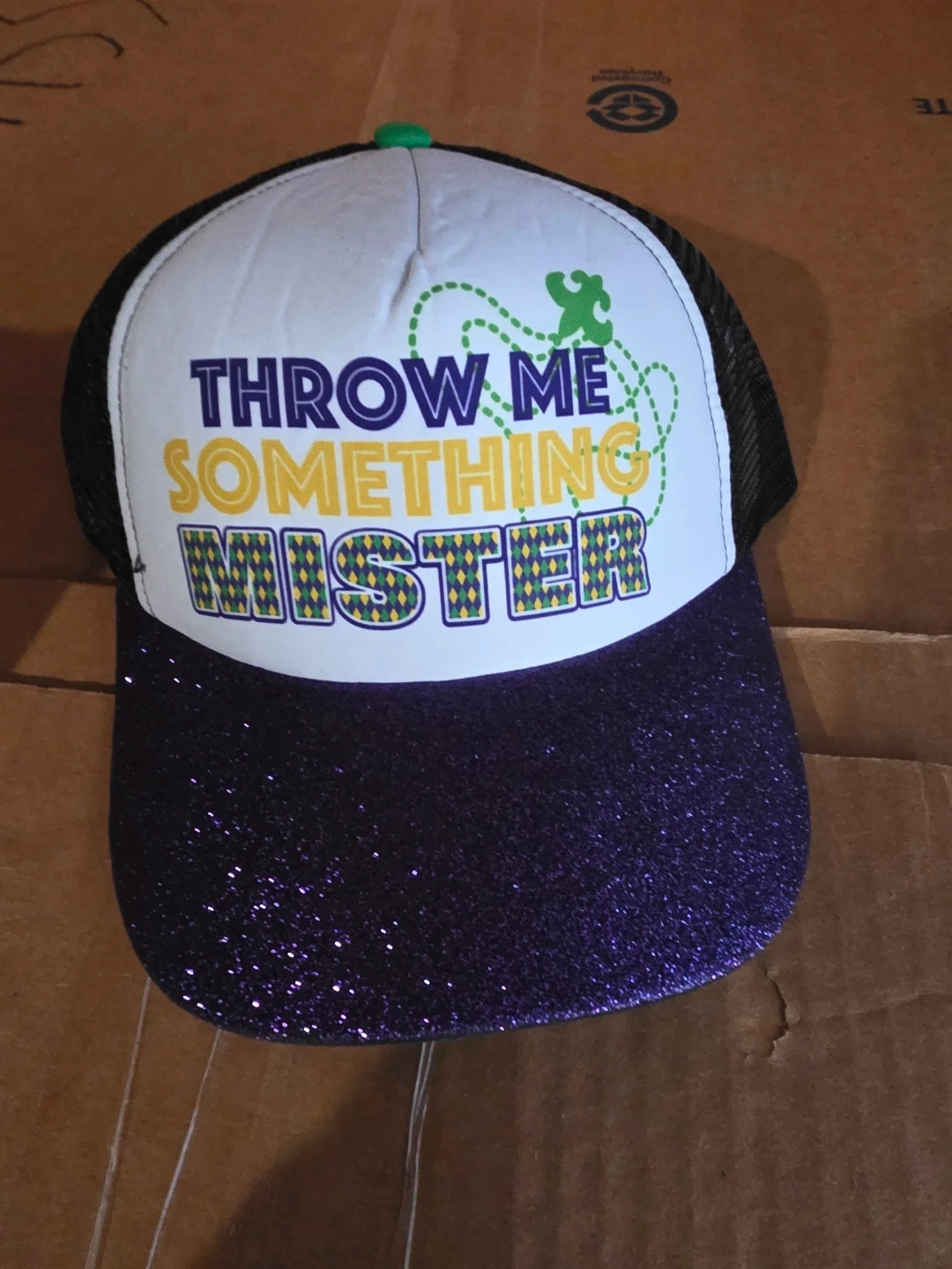 I'm selling a Mardi Gras themed trucker hat. It has a black mesh back and a sparkly purple brim. The front says, "Throw Me Something Mister!" I have a total of eleven of them