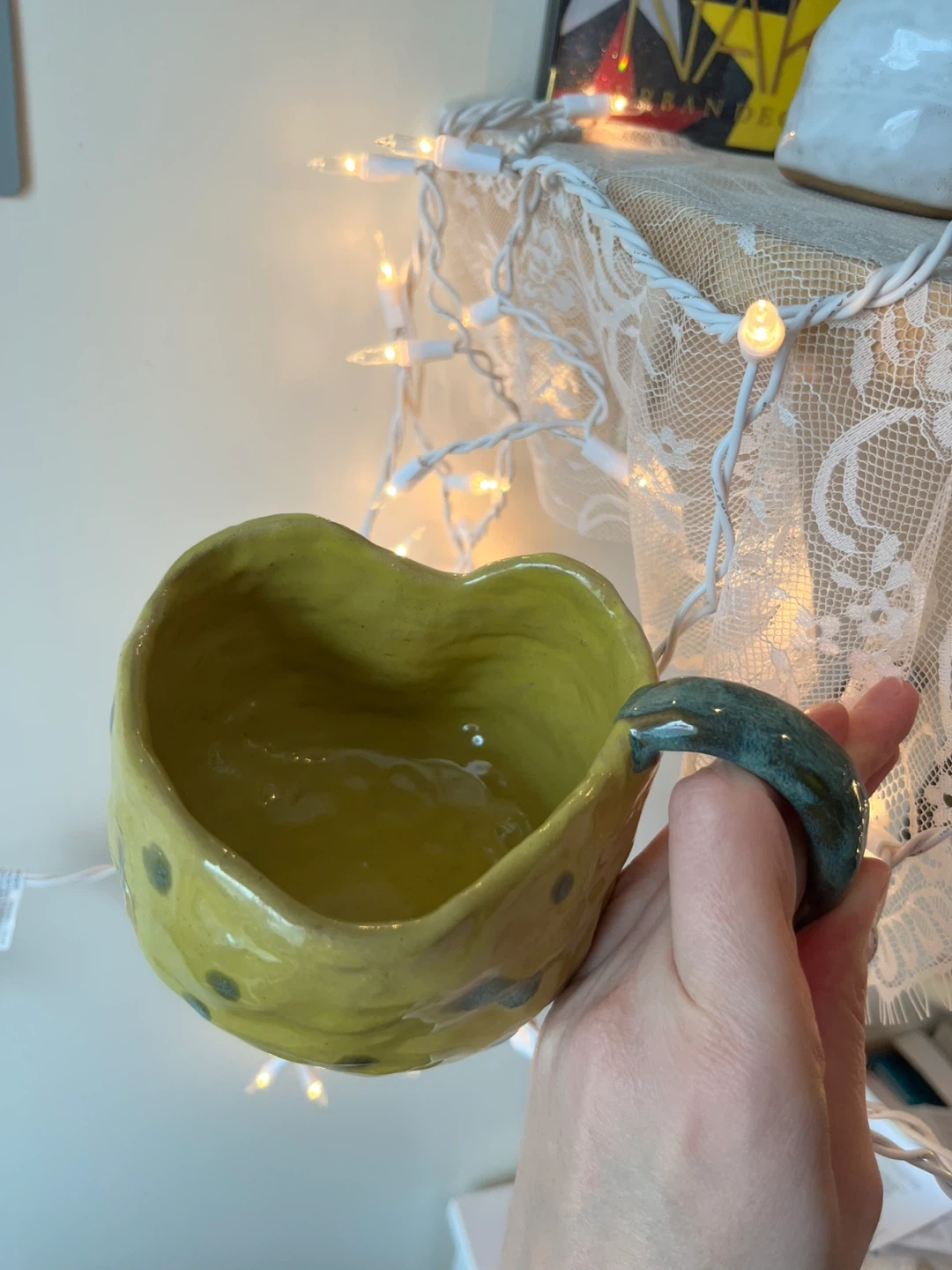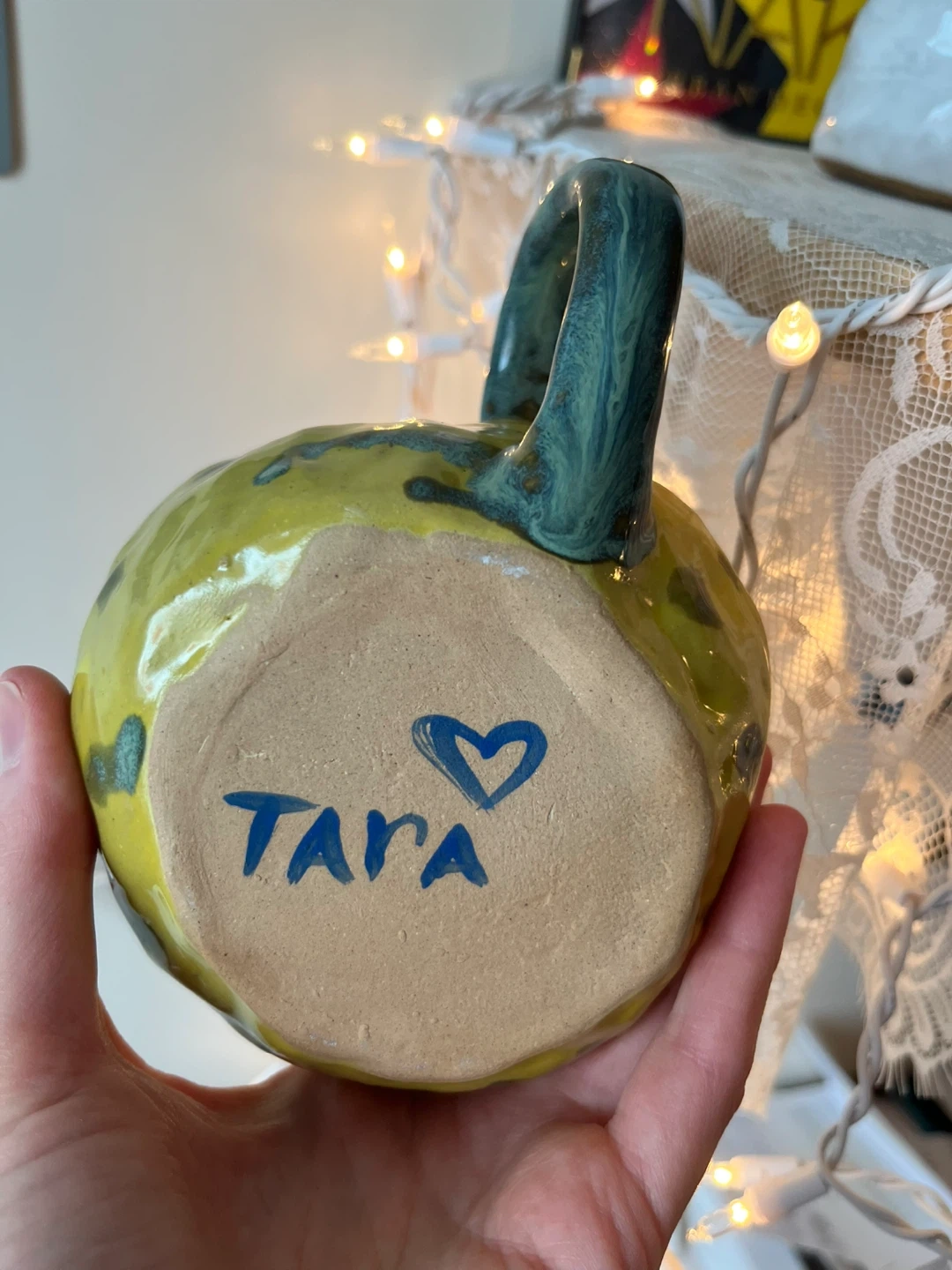 Unique handmade ceramic mug with a bright yellow glaze and scattered blue speckles. It features a distinctive wavy shape and a contrasting teal-colored handle. The bottom is signed with 'Tara' and a heart symbol. 500. ml