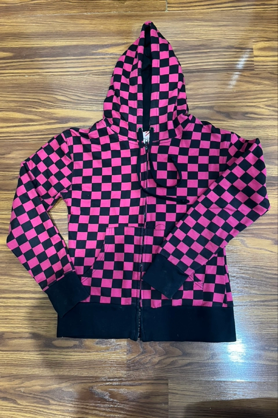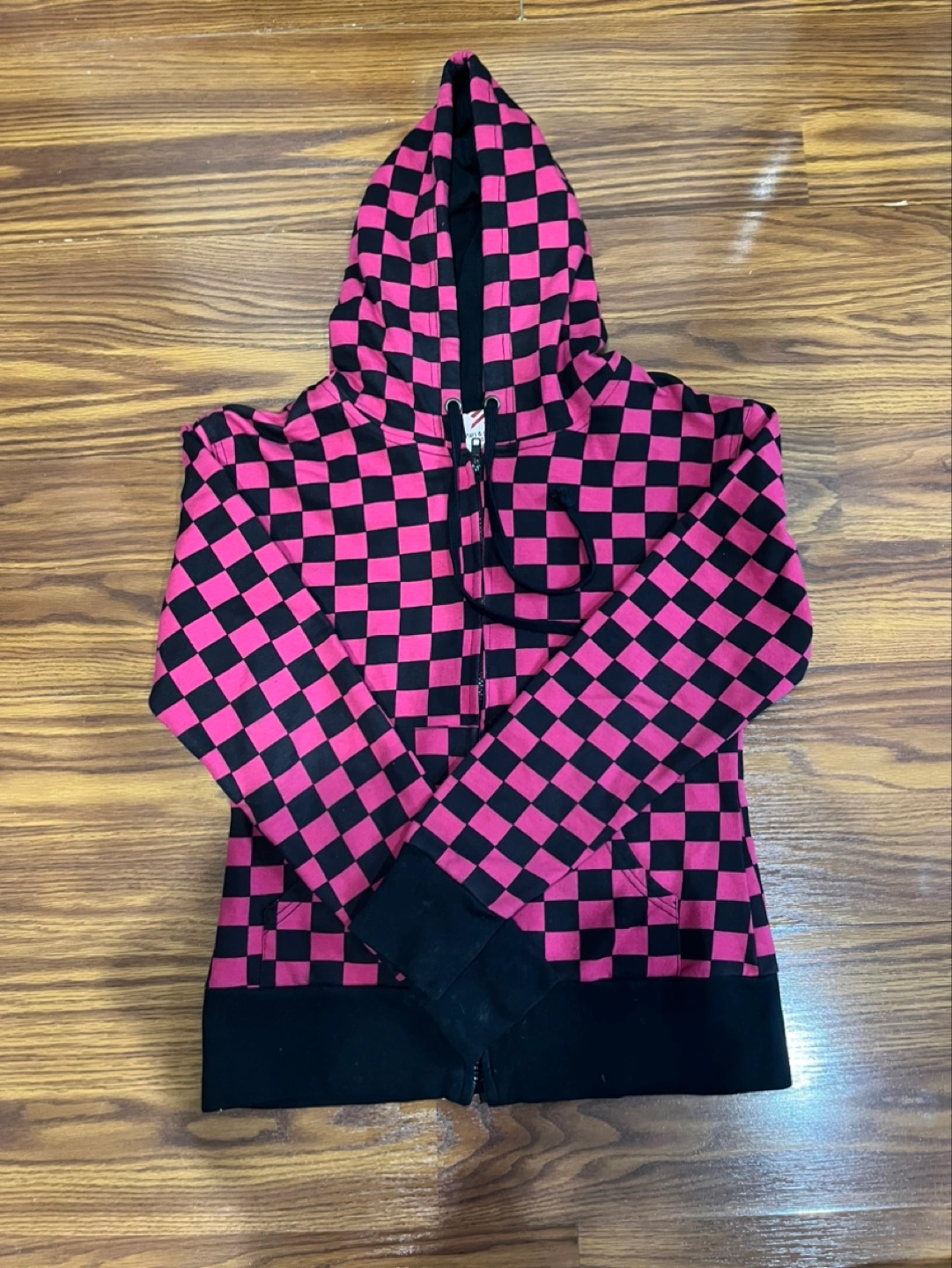 Women's zip-up hoodie. Pink and black checkered pattern. Long sleeves, drawstring hood. Great for casual wear.