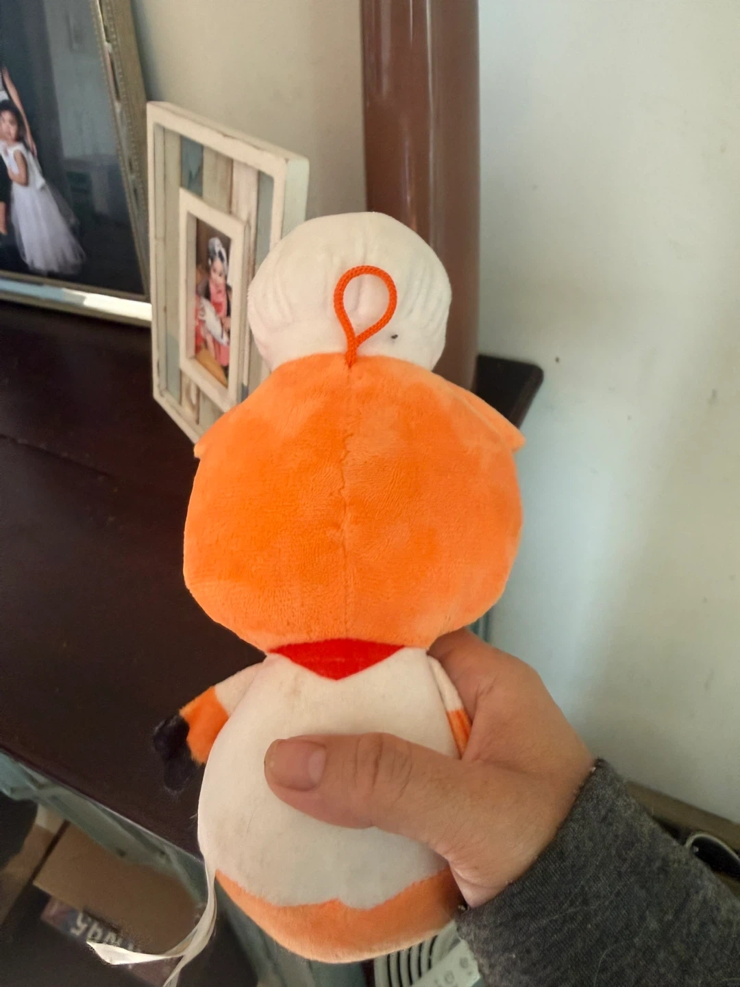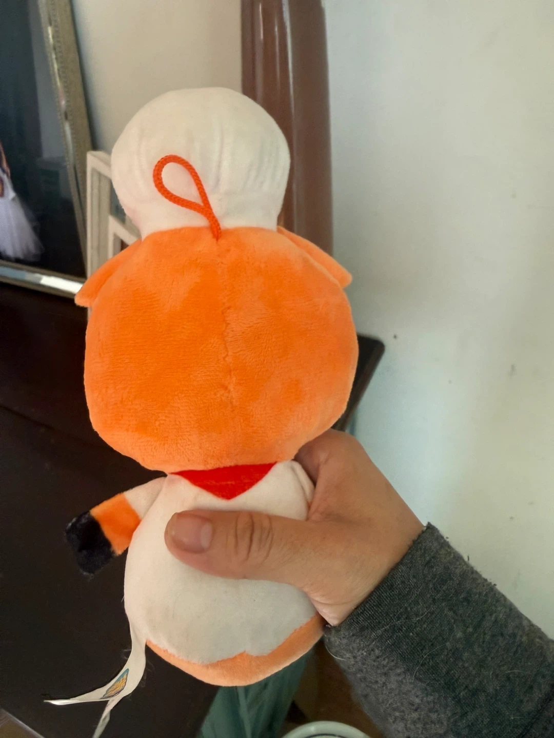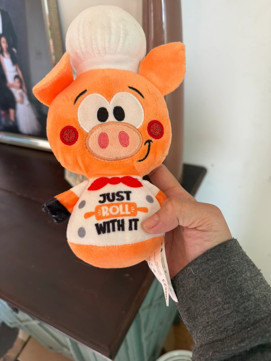 This cute orange pig plush wears a chef hat and apron. It has "Just Roll With It" printed on its shirt. Soft, stuffed material.