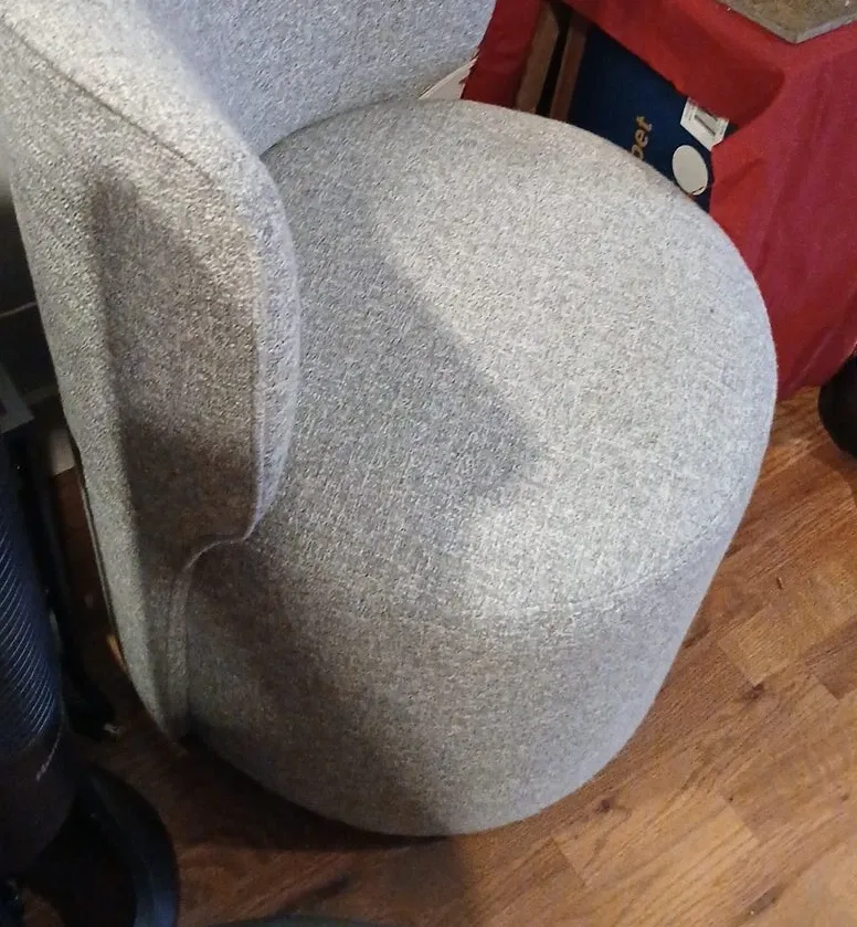 This cozy accent chair has a soft, speckled gray fabric upholstery. Its rounded shape and comfortable design make it a great addition to any living space. Upholstered in a durable, textured fabric.