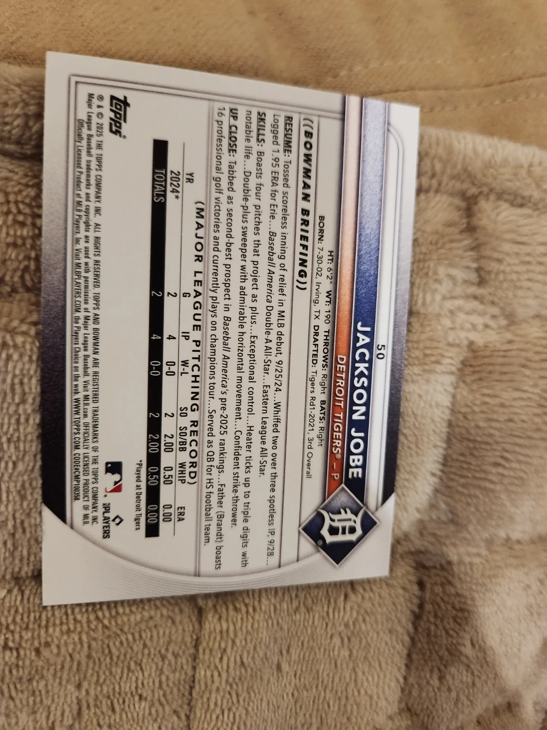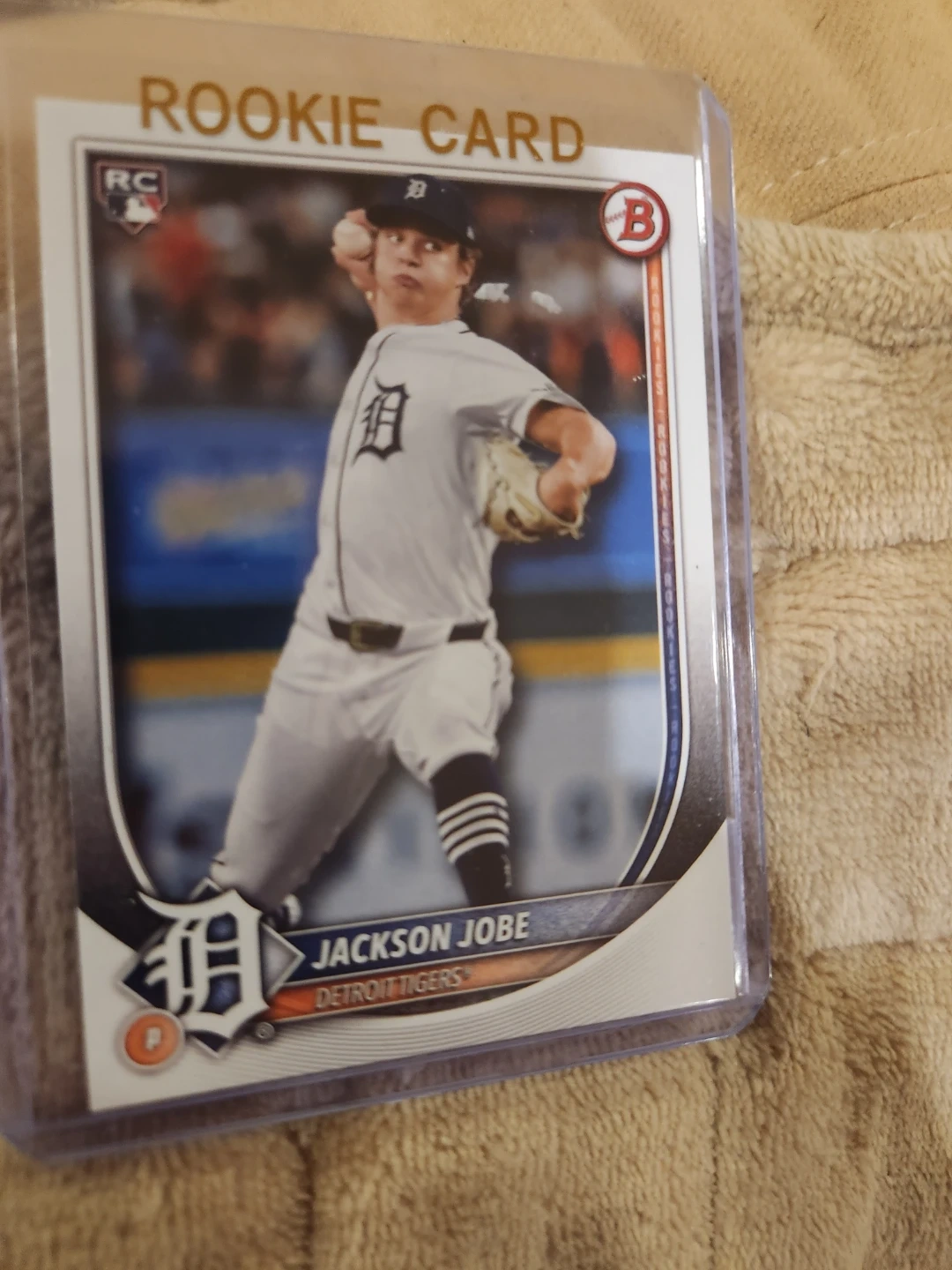 This is a 2023 Bowman Chrome rookie card for Jackson Jobe of the Detroit Tigers. It's a highly sought-after card for collectors. The card features a clear image of Jobe on the mound.