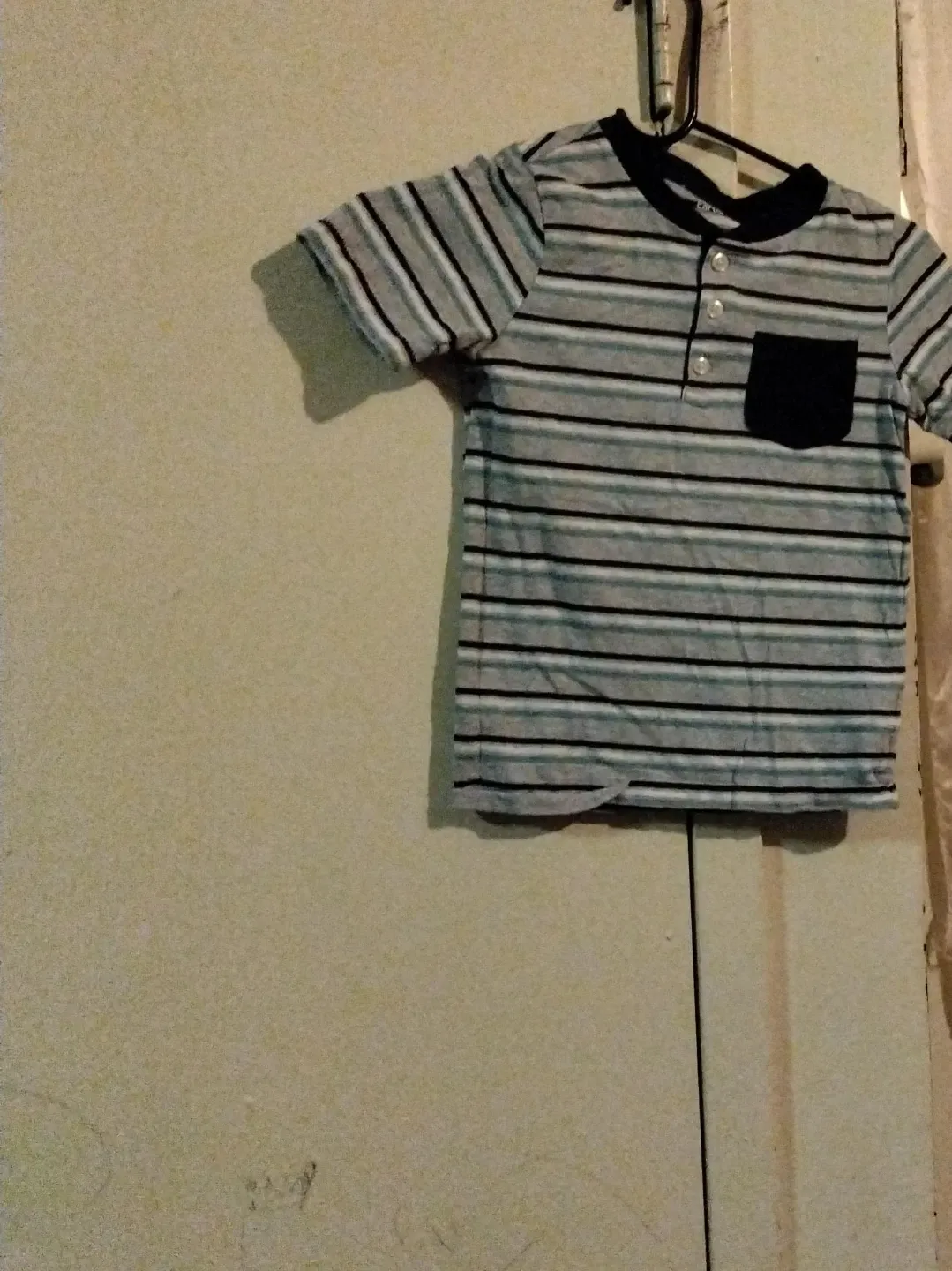 Short-sleeve striped henley t-shirt with a chest pocket. Features a black collar and button placket. Made for comfortable wear.