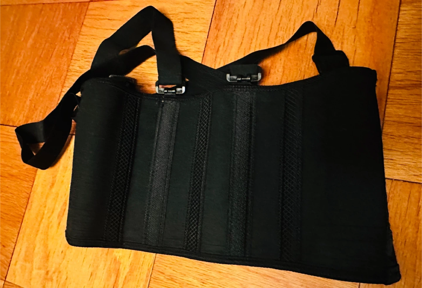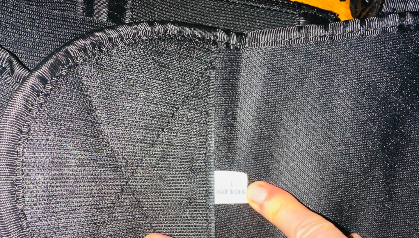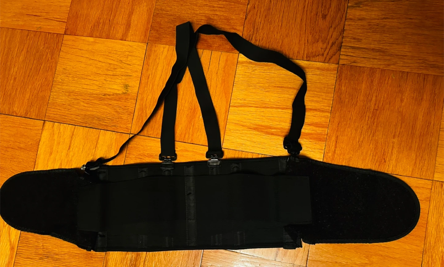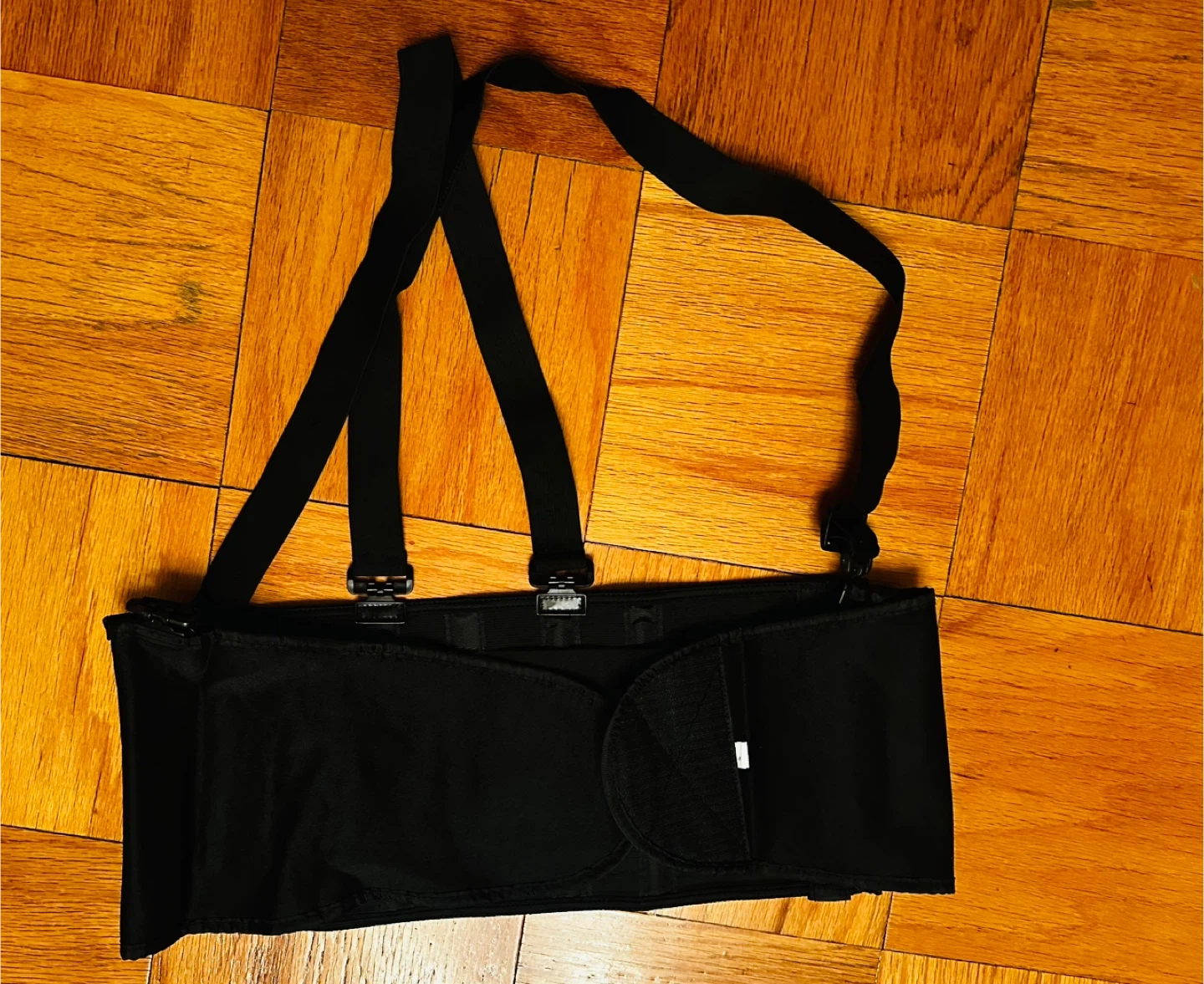 This is a black back support brace with adjustable suspenders. It's a size L and made in China. It's designed to offer support for the back.