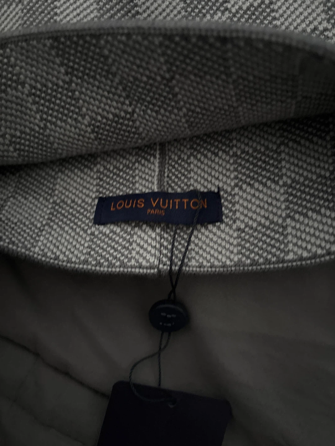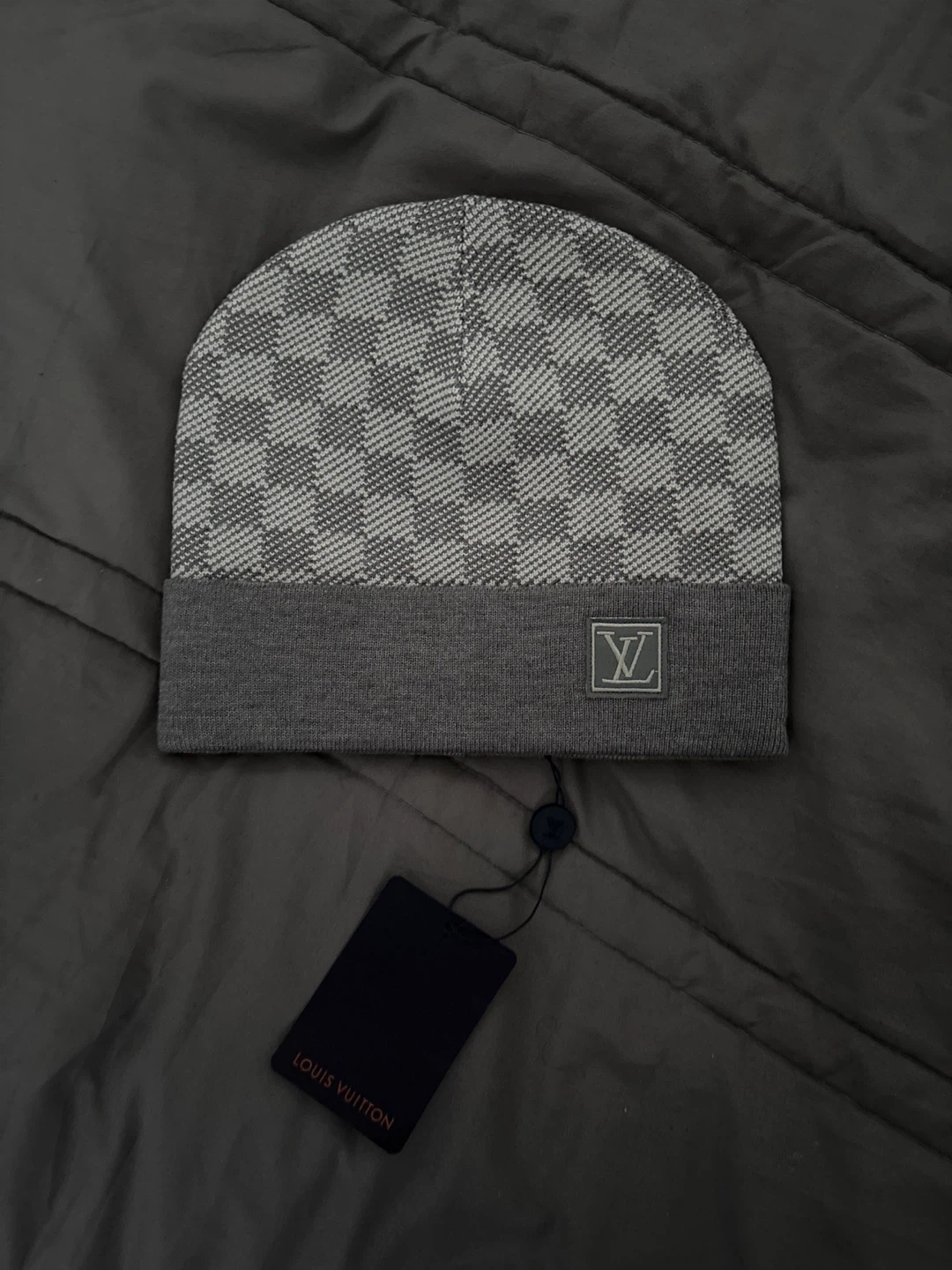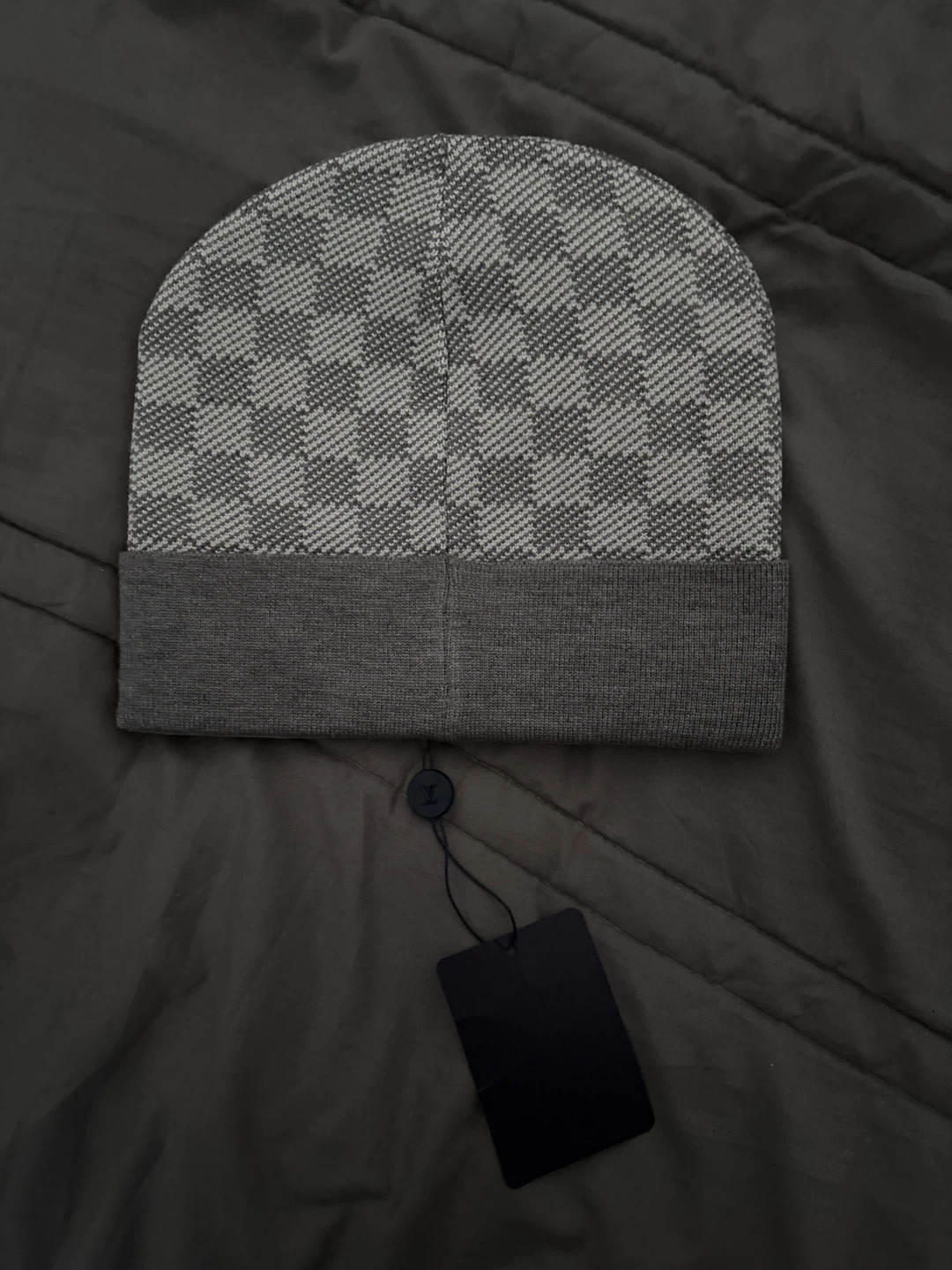 Louis Vuitton beanie in a gray checkered pattern. Features a solid gray cuff and a metal emblem. A stylish accessory for cooler weather!