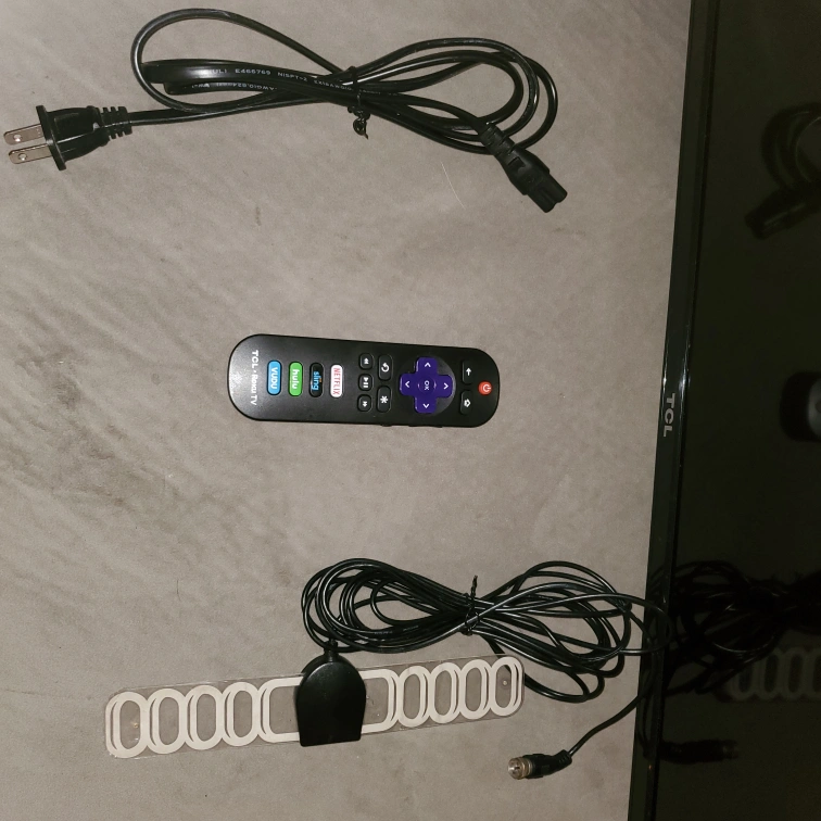 A TV ready to watch your favorite movies. It has legs and the screen appears to be in good condition. Includes a remote and power cord, along with an antenna. This TV is perfect for cozy movie nights at home with free antena tv